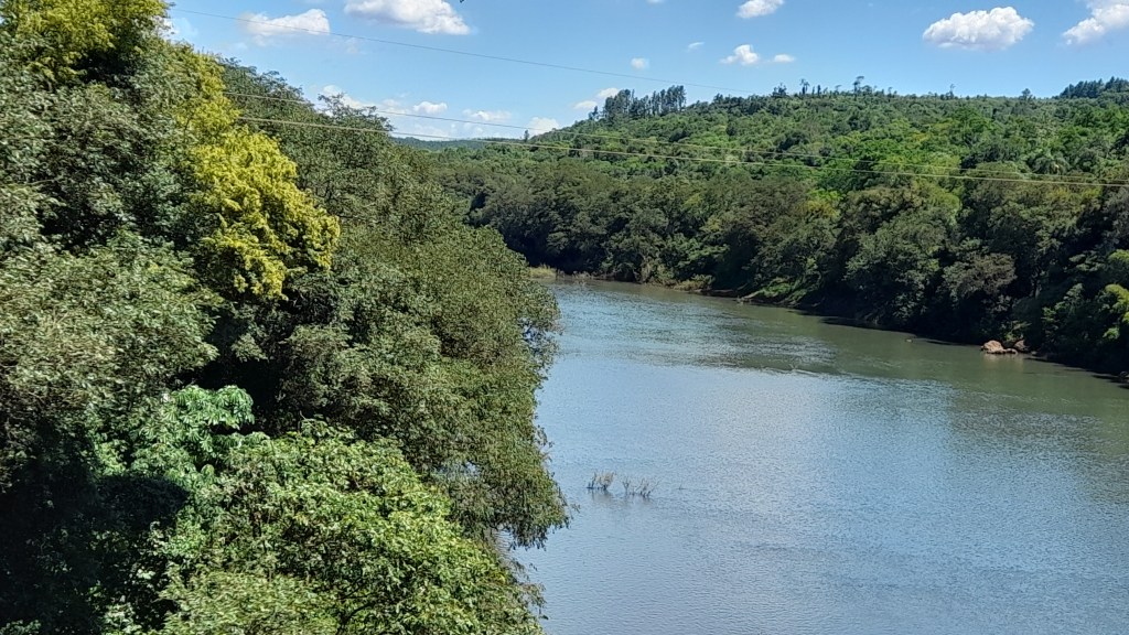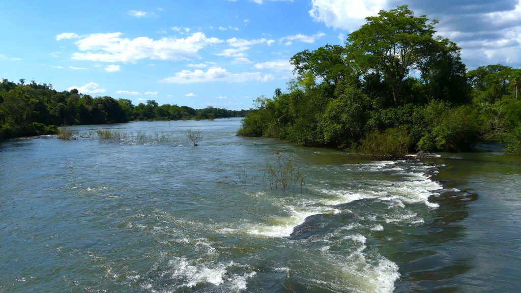 We rijden zo’n 4 uur noordwaarts en zien het landschap veranderen. De vlakke pampa maakt plaats voor golvende heuvels met subtropisch regenwoud. Regelmatig steken we rivieren en beken over en het wordt ook heet. Het wegdek is redelijk tot slecht, met een sterke spoorvorming veroorzaakt door de vele zware vrachtwagens. Voor dit gehobbel moeten we ook nog twee keer tol betalen, 1300 pesos per traject (= € 0,80).