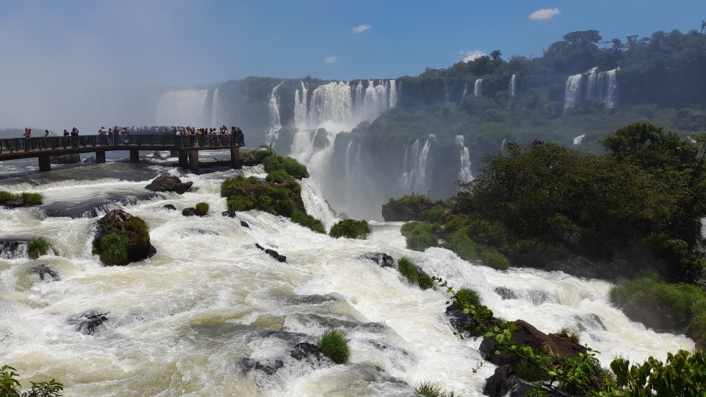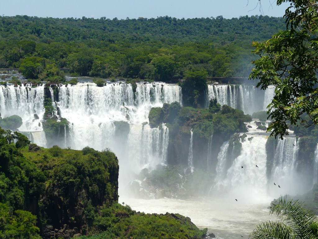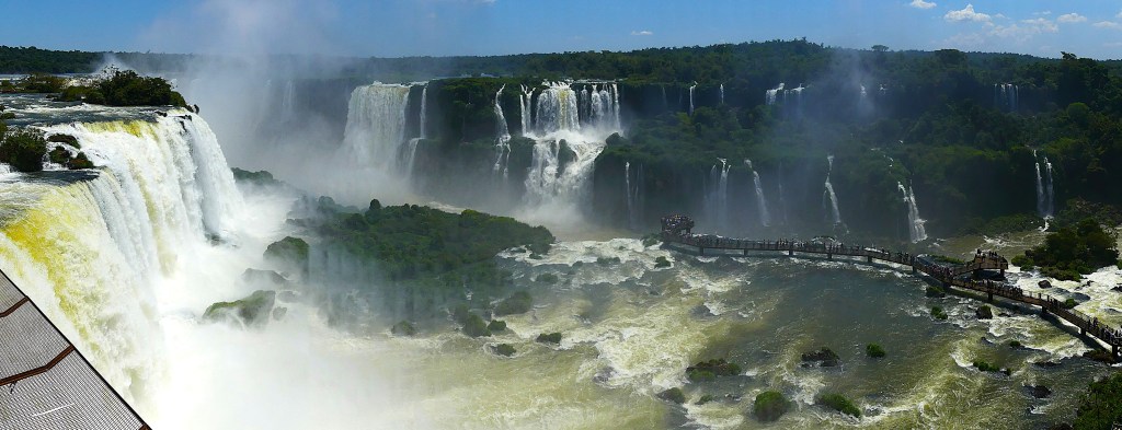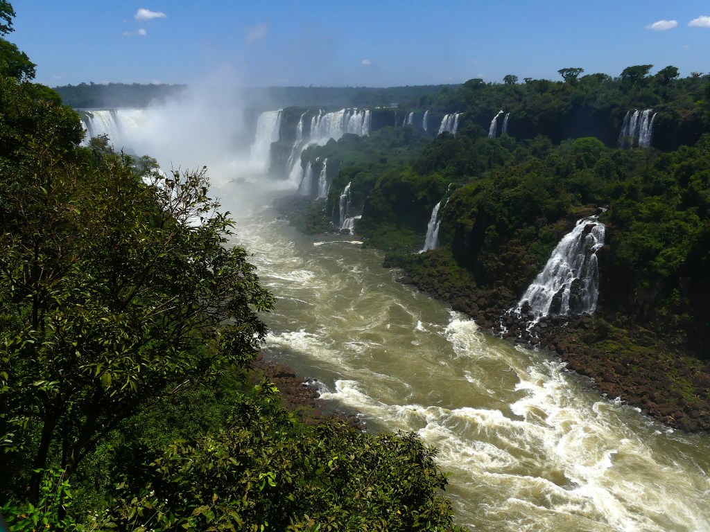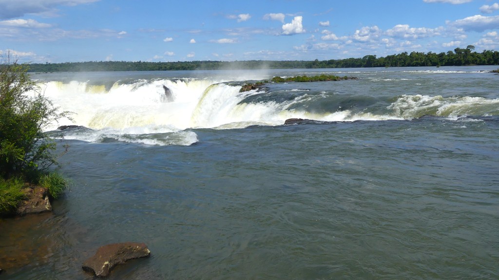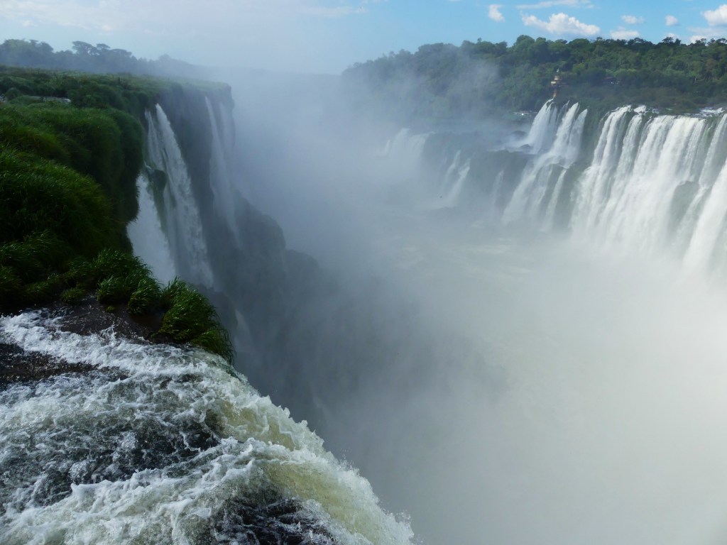 In Puerto Iguazú zoeken we naar een camping, want vrij kamperen is in dit beschermde gebied niet mogelijk. We komen terecht in een tuin van particulieren aan de rivier Paraná. Vandaag is het bezoek aan de cataratas, Devil’s Throat’, ‘Garganta del Diablo’ of simpel gezegd de watervallen. Het ‘Parque Nacional Iguazú’ ligt deels in Argentinië en deels in Brazilië. De grens tussen deze twee landen loopt door de rivier ‘Iguazú’ waardoor de watervallen zowel aan de Argentijnse als de Braziliaanse kant zijn te zien. Vandaag doen we de Argentijnse kant, overmorgen de Braziliaanse. Er zijn meer dan 275 afzonderlijke watervallen die zich uitstrekken over bijna drie kilometer, waardoor het één van de grootste watervalsystemen ter wereld is. We lopen over een metalen vlonderpad die van eiland naar eiland en boven de rivier is aangelegd. Naarmate we dichterbij het uitkijkpunt komen, horen we het gedreun van de waterval en zien we de mist in de verte al opdoemen. En dan staan we oog in oog met de ‘duivenskeel’, de grote halfronde waterval van 150 meter breed en waar het water 80 meter in de diepte stort.