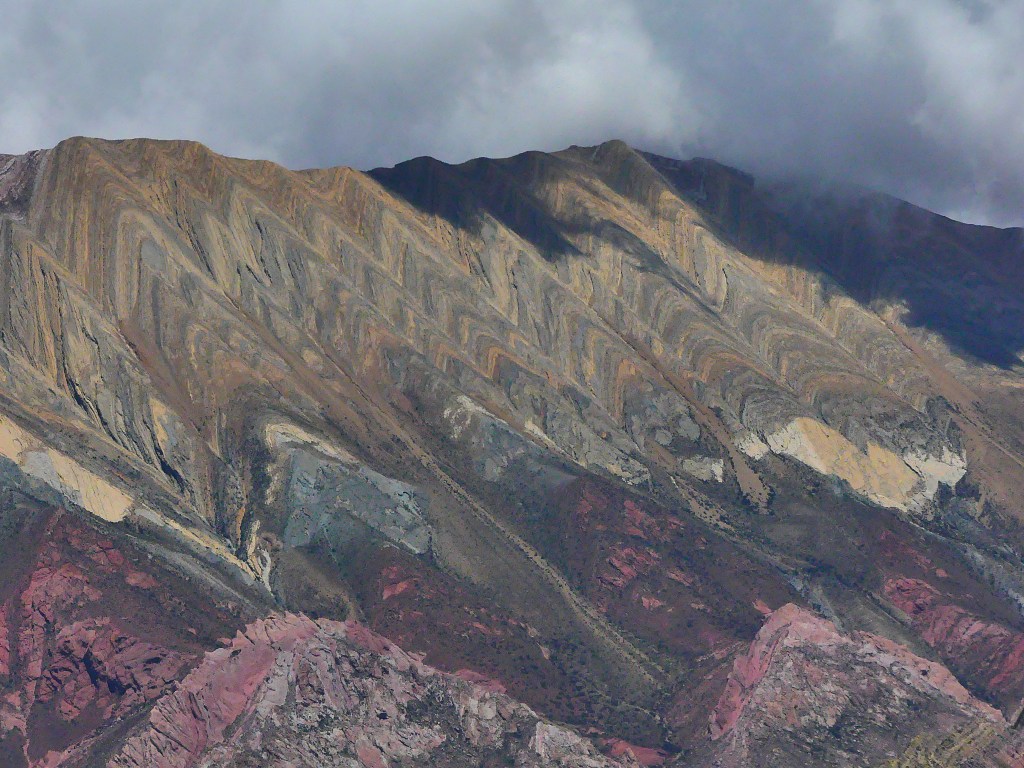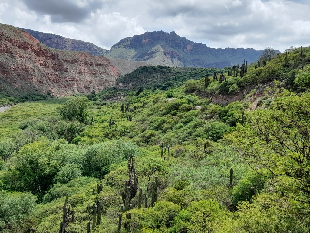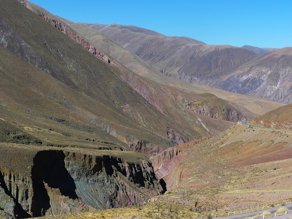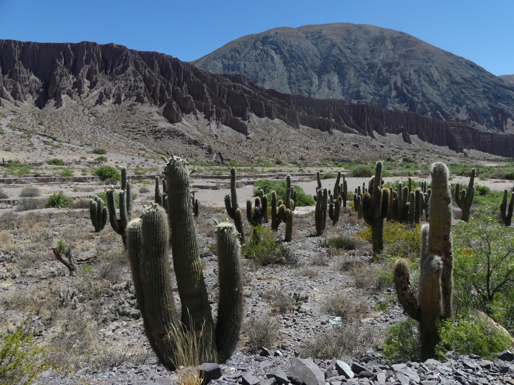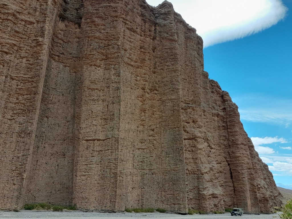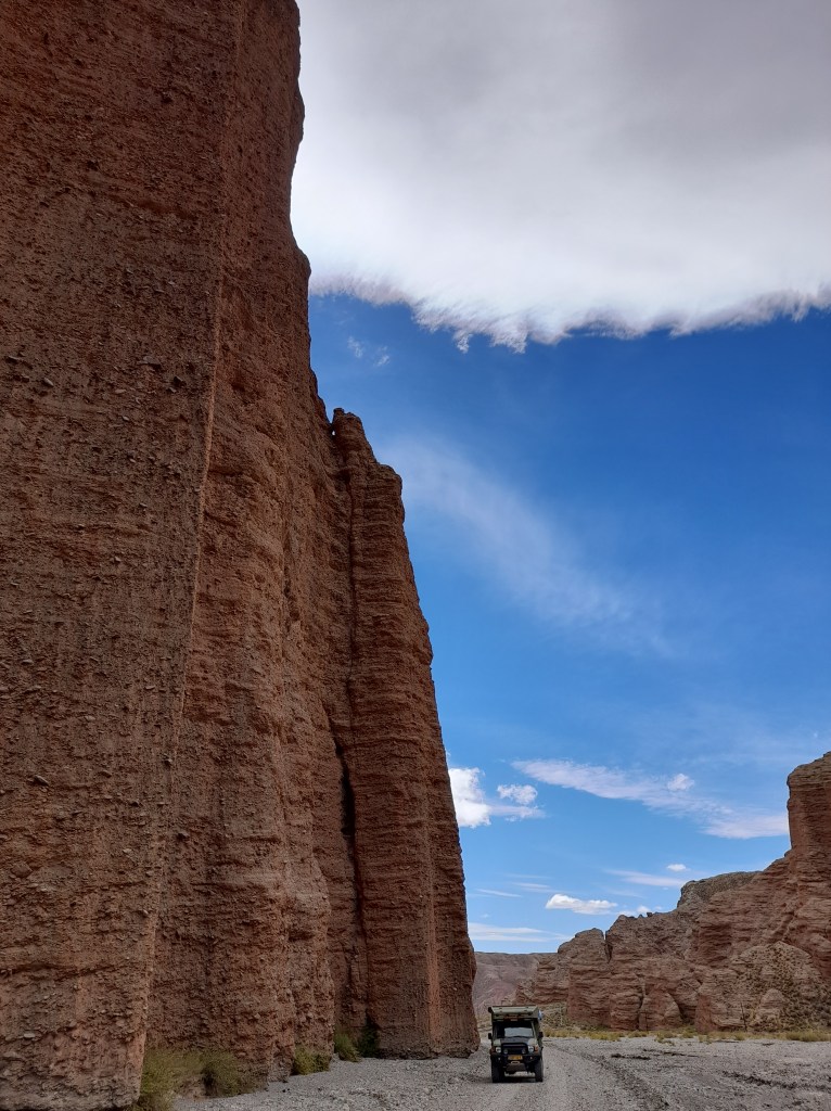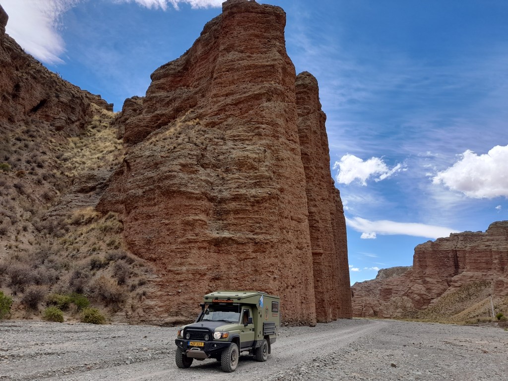 De dag begint met boodschappen doen. We zorgen er voor dat we onze water- en voedselvoorraad in de grotere plaatsen aanvullen, want de kleinere dorpen hebben weinig tot geen winkels, hier kiosko genaamd. Dat geldt ook voor de brandstof, want we willen ‘in the middle of nowhere’ uiteraard niet zonder benzine komen te staan. Ruta 40 is een befaamde route onder de Overlanders die begint in Ushuaia, de meest zuidelijke plaats van Argentinië en eindigt in La Quiaca vlak voor de grens van Bolivia. De 5121 km lange weg bestaat uit dirtroads, leidt over hoogtes tot 4000m en hoger en biedt een verscheidenheid aan prachtige natuur langs de grens met Chili. Ons plan is om min of meer Ruta 40 te volgen en om hier en daar af te wijken van deze route om andere interessante gebieden te bezichtigen. Wij beginnen bij het eindpunt La Quiaca gelegen in de provincie Jujuy (spreek uit: Gugui). Zodra we het dorp uit zijn, begint de dirtroad. Na een heuvelachtig landschap bedekt met groene begroeiing van planten rijden we een kloof in en plotseling staan we voor een verticale roodbruine rotswand van wel 60 meter hoog.