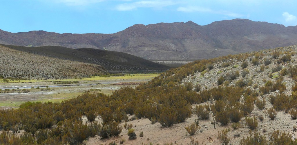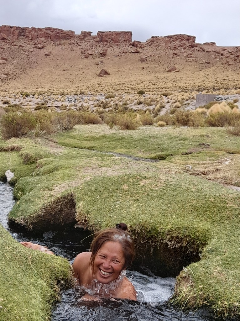 De volgende dag passeren we de vulkaan Cerro Tugli, ook genaamd Cerro Tuzgle en deze is 5500m hoog. Langs de route zien we opeens een modern ogend gebouw en dat bevreemdt ons. We gaan op onderzoek uit en zien dat het een thermaalbad is, maar helaas gesloten. Als we nog wat rondwandelen zien we een stroompje en dat is heerlijk warm! Niet getreuzeld, handdoeken pakken en erin! Het water ruikt niet naar zwavel, eerder wat gronderig. Geen slechte plek om op je gemak naar de vulkaan te kijken.