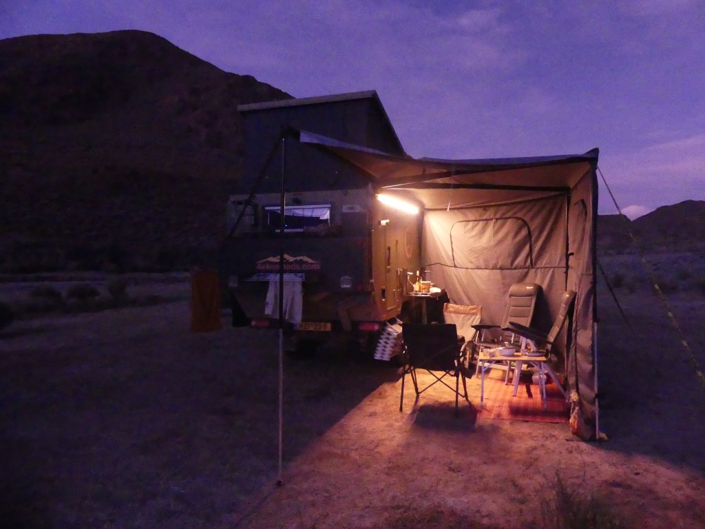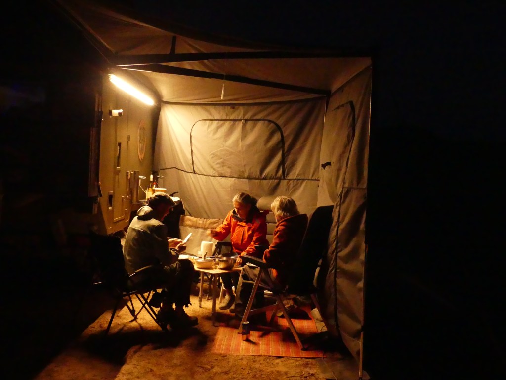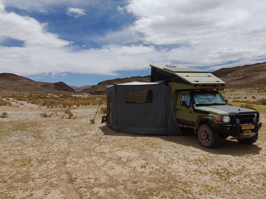 Het waait fors en dus zet Jeroen de luifel uit en haalt de zijwanden tevoorschijn. Door de zijwanden zijn we meer beschut tegen de wind. De eerste dag hebben we nog lol van de zijwanden, daarna draait de wind 180° en staat hij pal op ons! De auto draaien en alles afbreken en weer opbouwen vinden we geen optie en gelaten incasseren we de nieuwe situatie. Het is dan wel weekend, maar behalve rust nemen, zijn we voortdurend bezig met klusjes in de auto/truck, het huishouden draaiende te houden en reisplannen te maken voor de komende dagen. Als beloning trakteren we ons zelf op een ‘asado’ en probeert Jeroen de inklapbare BBQ uit. Het is een prachtig apparaat en zeer geschikt voor onderweg als je klein behuisd bent zoals wij. Door de harde wind is het lastig om de kooltjes voldoende heet te krijgen en dus proberen we windschermen te maken van een tafel en de opklapbare zonnepanelen. Na het nodige geduld eten we uiteindelijk heerlijk.