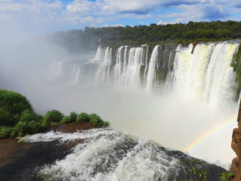 De middagzon schijnt op de waterdruppels waardoor we constant de regenboog zien. Soms komen de druppels zo hoog dat we een beetje nat worden, wat heerlijk verkoelend is. We krijgen geen genoeg van het adembenemende schouwspel van het bulderende water, de mist, de regenboog, de vele afzonderlijke cascades en het zicht op de immense kloof waar het water door stroomt.