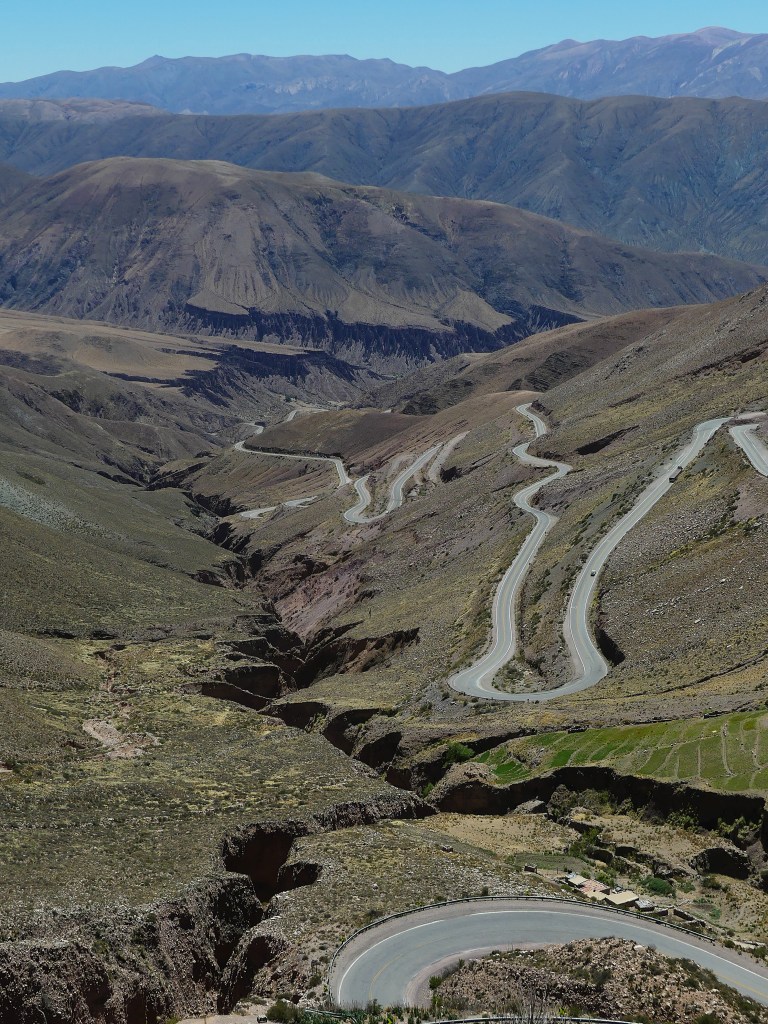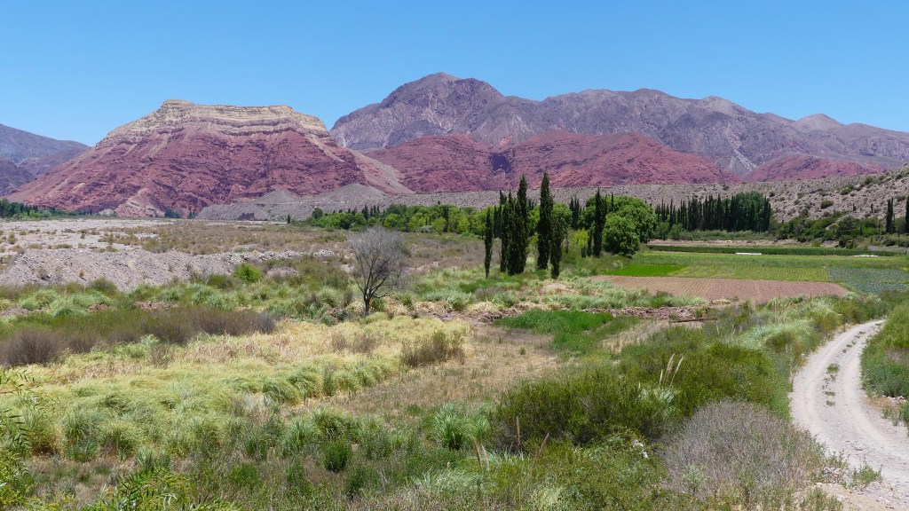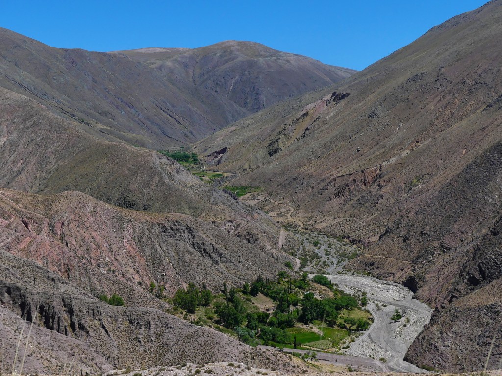 De volgende dag hebben we een korte rit van 70 km naar Humahuaca. Het is een prachtige route door de vallei. In het dorp doen we boodschappen en zien we vele muurschilderingen. We overnachten bij Camping Carolina. Op 3000m hoogte kun je prima slapen, ondervinden we. Deze camping even buiten Humahuaca bevalt ons wel, lekker rustig, gras onder onze blote voetjes en schaduw van de wilgen en populieren. Overigens bomen die we hier in de gortdroge bergen niet snel zouden verwachten. Er moet dus veel grondwater zijn.