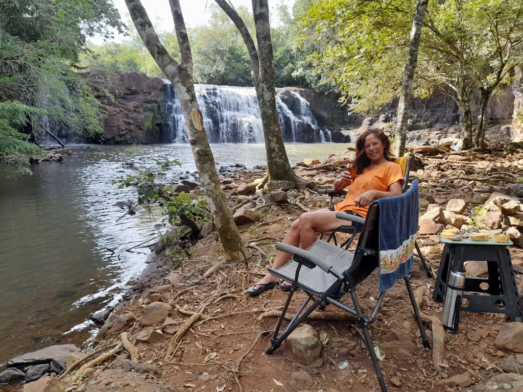 We zijn weer in Argentinië en pikken de Tembo Toy op bij het tankstation waar we hem hadden achtergelaten. We verlaten Puerto Iguazú en nemen een zandpad dwars door het regenwoud van Misiones heen. We vinden een bivak op een parkeerplaats bij een prachtige waterval (al weer één) vlak bij San Antonio. We staan er alleen en genieten van de rust, de vele vuurvliegjes en de halve maan die het terrein verlicht. Wat een stille nacht, geen hanengekraai, schreeuwende papegaaien of auto’s, alleen het geruis van de waterval. Het is zondagochtend en voor de Argentijnen familiedag. Mensen komen massaal met opklapstoelen, koelboxen en grote zakken gevuld met witte broodjes. De kinderen duiken meteen het water in, de moeders passen op de allerjongste van het gezin en de vaders spelen met vuur. Dat wil zeggen, zij bereiden de ‘parrilla’ (BBQ) voor op de reeds aanwezige plaatsen die simpel gemaakt zijn met grote stenen.