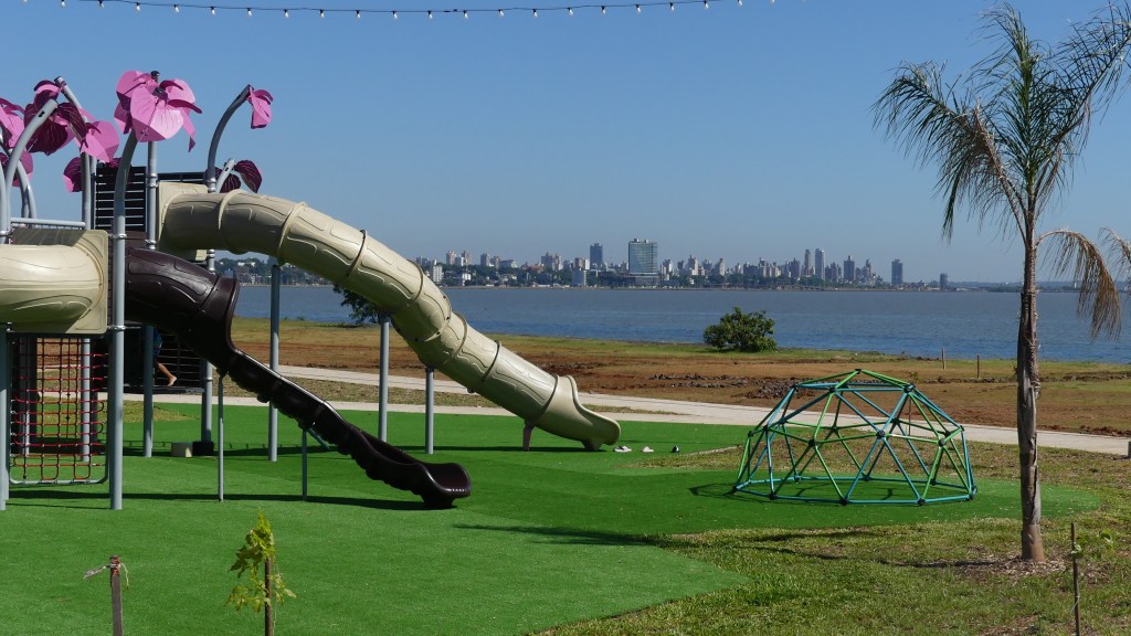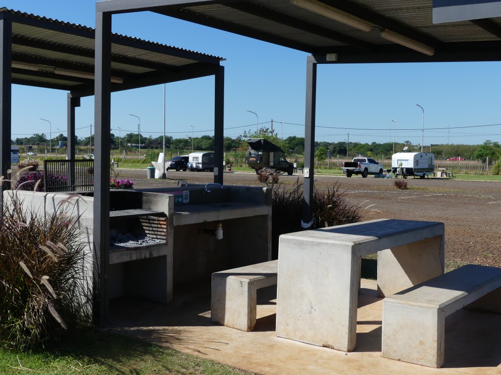 Het is een flink stuk rijden van Bonpland naar Posada. Het landschap is in onze ogen wat saai en eentonig. Het is vooral vlak grasland met koeien wat de klok slaat. De stad Posadas heeft ruim 350.000 inwoners, vergelijkbaar met de stad Utrecht in Nederland. Het ligt aan de rivier ‘Rio Paraná’ en aan de overkant zien we Paraguay. We rijden het centrum in om een simkaart te kopen voor onze mifirouter. Alles blijkt gesloten in verband met een feestdag. Om onze teleurstelling te boven te komen, nemen we een echt goede milkshake en gaan we daarna uit eten. Het is al 7 uur in de avond en we parkeren de Toy op een soort recreatieterrein langs de rivier, even buiten de stad. Het is een gebied in ontwikkeling en alles is nieuw: brandschoon sanitair, zitjes met BBQ en gootsteen, speeltoestellen, zwembad, fitnessapparatuur en beachvolleybalvelden. Massaal zitten families en groepjes vrienden op de (kunst)grasvelden en de sfeer is zeer gemoedelijk. Opvallend is een verbodsbord waar onder andere staat dat je je ‘mate’ hier niet mag schoonmaken. Tegen betaling mogen we er overnachten.