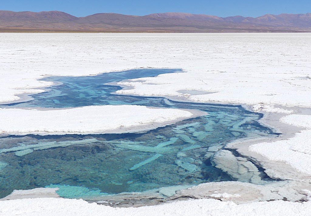 Net na de pas van 4170m zien we plotseling in de verte het zoutmeer. Het landschap verandert na deze pas in glooiende groene bergen en we dalen af naar het zoutmeer ‘Salinas Grandes’, het op drie na grootste zoutmeer in Zuid-Amerika. Inmiddels bevinden we ons op een hoogte van 3440 meter. Dan is het tijd voor een rit over het zoutmeer. Om hierover te rijden is het verplicht om voor een klein bedrag (€ 1,20 p.p.) een gids met auto te huren. Hij rijdt voor en wij volgen. We bezoeken twee plaatsen op het zoutmeer, dat 200² km groot is. De eerste plek is waar het zout voor de consumptie wordt gewonnen in gegraven kanalen. We zien de beginnende zoutkristallen in het helblauwe water drijven. Aan de rand van de kanalen vormen zich de vierkante zoutkristallen. Het water is zoet grondwater,  afkomstig van de Andes. De tweede plek is een soort wak waar de zoutkristallen aan de rand zijn te zien. Als we genoeg hebben gezien, rijden we dezelfde weg terug naar de camping.
