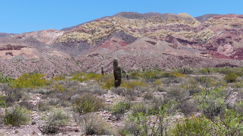 Als we de volgende dag met de campingeigenaar Xavier in het Spaans (!) kletsen, geeft hij de tip dat we naar het zoutmeer ‘Salinas Grandes’ kunnen rijden, 63 km door de vallei en over de bergpas van 4170 meter hoog. Na de koffie vertrekken we, rijden over Ruta 52 langs de ‘Rio de Quibrada de Purmamarca’ waar nauwelijks water in stroomt en we zijn meteen enthousiast over wat we zien. Prachtige rotsen met verschillende kleuren en grote cactussen. Als we bijna bij de bergpas zijn, stoppen we bij het uitzichtpunt ‘Mirador Valle de Lipan’ waar de gehele vallei te zien is die we hebben gereden  Wat een prachtig panoramisch uitzicht.