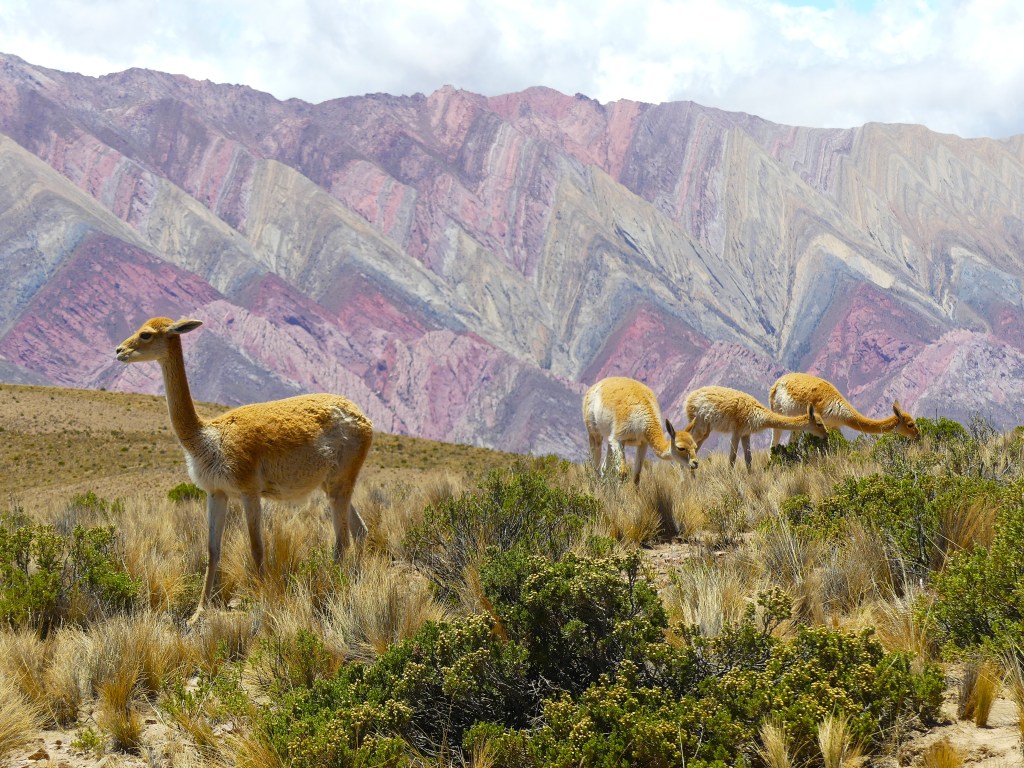 Tegen het middaguur rijden we weg naar ‘Mirador a la Cercanía de los 14 Colores del Hornocal’, oftewel bergen met 14 kleuren. De piste (hier ‘ripio’ genoemd) is over het algemeen in redelijke staat en we stijgen in rap tempo. We rijden een uur en bereiken het uitzichtpunt op 4350m hoogte. Mooie getande zigzagbergen in vele tinten. Met enige fantasie tellen we de beloofde 14 kleuren. Het is een mooi plaatje met de kudde vicuñas op de voorgrond. In Zuid-Amerika leven 4 soorten kameelachtigen: de vicuña, de guanaco, de alpaca en de lama die gedomesticeerd is.