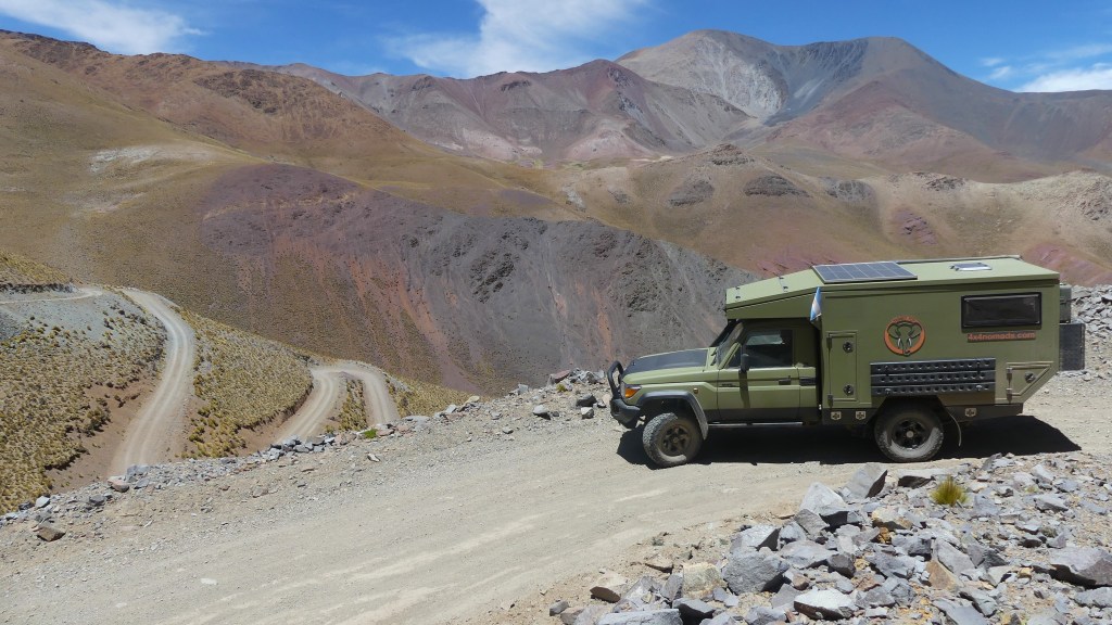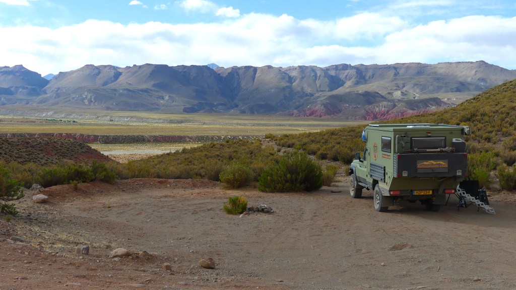 De af en toe bizarre landschappen blijven zich aan ons presenteren. Grijze bergen bij ‘Mirador Penitentes Grises’, groene bergen, rode bergen, witte bergen, enorme rotsblokken….. Het houdt niet op! We volgen de routeplanner, maar komen per ongeluk op een private weg terecht. We pakken een ander pad en dat blijkt min of meer dood te lopen. Geen probleem in lage gearing en Jeroen rijdt de Tembo Toy door de kuilen. Zo’n 5 km voor Susques vinden we een bivakplek. Als we ons net hebben geïnstalleerd, komt de landeigenaar langsrijden en zeer vriendelijk geeft hij toestemming voor onze overnachting. Twee ezeltjes kijken toe en de lama’s lopen om ons heen.