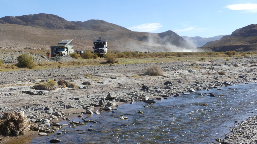 Voor vandaag hebben we genoeg gereden. We zijn onder de indruk en moe van al het moois dat we onderweg hebben gezien en we vinden een mooie plek voor een bivak aan de ‘Rio San Antonio de los Cobres’, 2 km voor het gelijknamige dorp. We voelen ons verreist en op deze plek zullen we een paar dagen verblijven. Het waait fors en dus wordt de auto met de kop in de wind gezet. Ook hier slapen we hoog, zo’n 3700m. We merken dat we er al beter mee om kunnen gaan, maar we zijn beiden al snel buitenadem als we even iets fysieks doen. Ook moeten  we blijven smeren, want de lucht is gortdroog. Het gevolg: droge lippen en pijnlijke kloofjes in vingers en hakken.