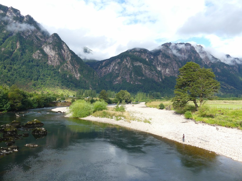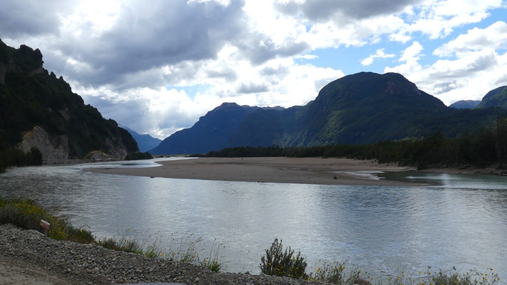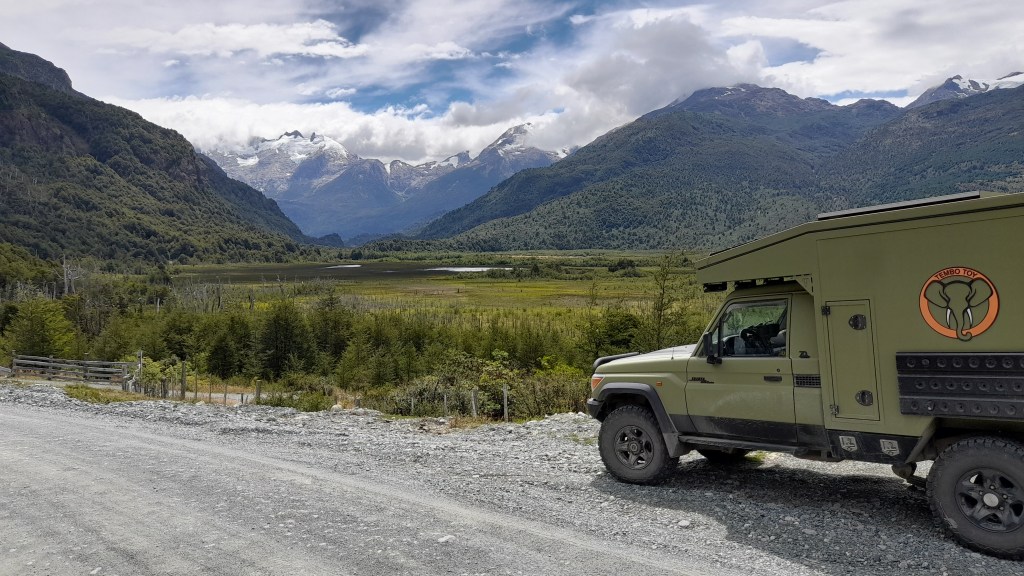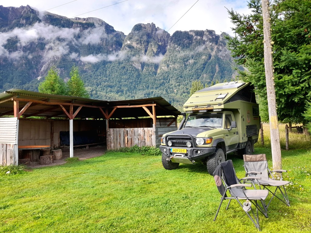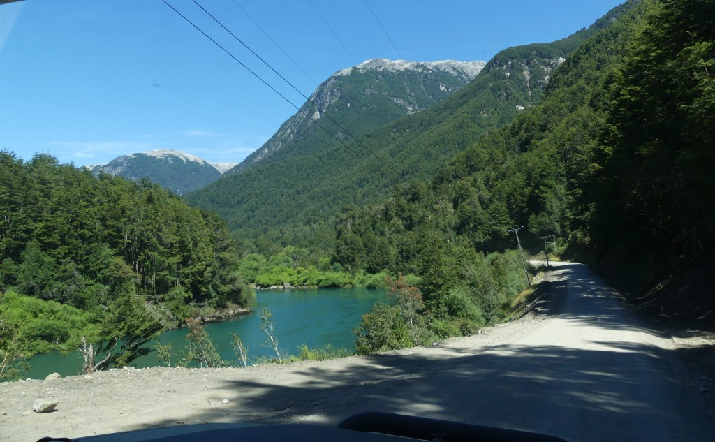 Nadat we in het Argentijnse dorp Trevelín de twee tanks hebben volgetankt met goedkope benzine, rijden we richting Chili. We passeren ‘Campo de Tulipanes’ waar je prachtige plaatjes kunt schieten van allerlei gekleurde tulpen met bergen op de achtergrond. Alleen zijn wij twee maanden te laat, de tulpen zijn geoogst, dus rijden wij door. We raken onder de indruk van de bergen in ‘Parque Nacional Los Alerces’. Werkelijk prachtig! We rijden over een brug met onder ons de snelstromende Futaleufú rivier, maken een bocht naar links en staan voor de Argentijnse grens. Daar worden onze paspoorten en de TIP afgestempeld en Jeroen verwijdert de Argentijnse vlag van de Tembo Toy. Vervolgens rijden we naar de Chileense grens waar wederom een paspoortcontrole is en de auto een TIP krijgt voor 3 maanden. Dan volgt de SAG-controle. Twee mannen stappen de cabine in, openen twee kasten en de koelkast en constateren dat we geen vers fruit, groente en zuivel hebben. Deze procedure gaat heel gemoedelijk en met een glimlach. “Veel plezier in Chili. Buen viaje.” En dan rijden we in Chili. Meteen valt ons op dat het ontzettend groen is in tegenstelling tot Argentinië. We vinden dat het veel weg heeft van de Alpen. In het dorp Futaleufú zijn alle huizen van hout gebouwd. We pinnen Chileense pesos, doen wat boodschappen, drinken koffie, nemen er iets lekkers bij en zijn een vermogen kwijt. Veel toeristen komen hier om te kanoën of te raften en dus zijn er legio boekingskantoren.