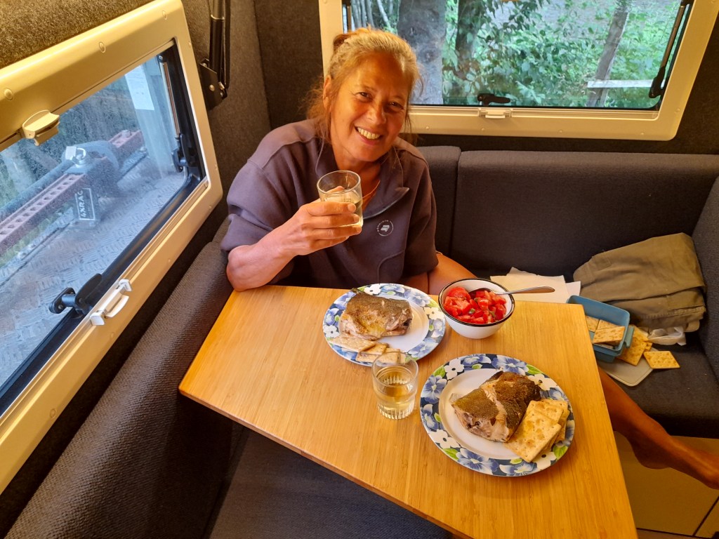 Het is hier aangenaam toeven: half bewolkt, rond 20 °C, weinig wind, bijna geen insecten. “Wat eten we vandaag?” vraagt Ina. “Forel”, antwoordt Jeroen vol zelfvertrouwen. Vandaag is het een ‘klusjesdag’. Ina doet wat was en maakt de toilet/doucheruimte schoon, terwijl Jeroen het droogtoilet een grote beurt geeft. Na de welverdiende koffie gaat Ina verder met het maken en installeren van het vliegengordijn. Alles moet met de hand genaaid en dat kost zeeën van tijd.