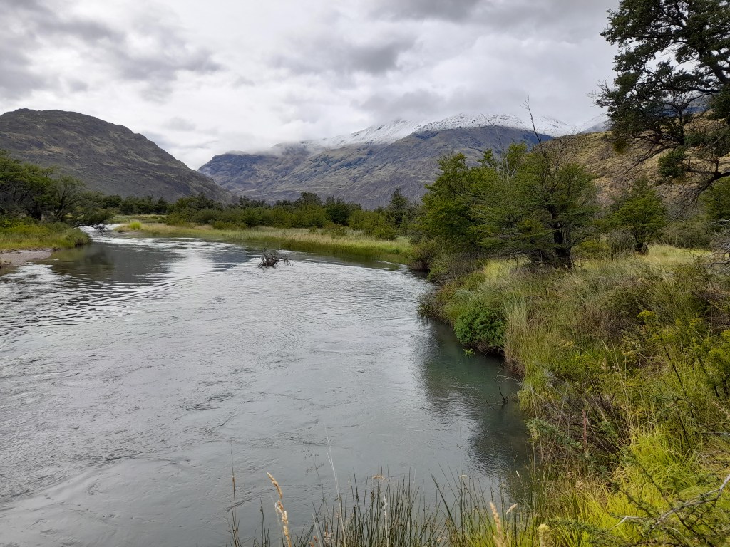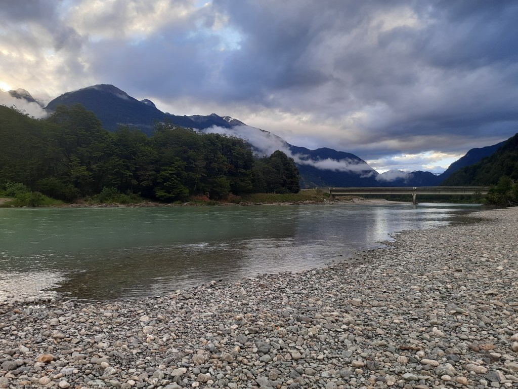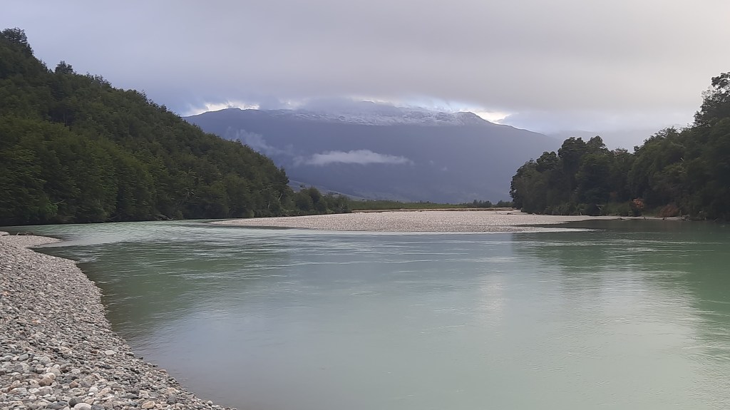 Het heeft in de nacht zacht doorgeregend en ook ’s ochtends is het druilerig. Het voelt fris en na lange tijd trekken we een lange broek en sokken aan. We vertrekken na de boodschappen en zijn benieuwd of we nog wat van de omgeving gaan zien, want het zit potdicht. We rijden langs meren en rivieren en missen de toppen van de bergen door de laaghangende bewolking. Toch valt er genoeg te genieten. Het wegdek is wisselend ripio en asfalt en bij Parque Cuesta Queulat stijgen we flink via talloze haarspeldbochten. De ripio is slecht en glibberig, vooral in de steile en krappe bochten en dus zet Jeroen de Toy in lage gearing. Dat rijdt veel comfortabeler. We hebben zin in koffie, maar in de kleine dorpen die we tegenkomen is niets te vinden. Bij Laguna de las Torres zetten we dus zelf maar onze koffie in de percolator en die smaakt ons best! Na 200 km en ruim 4 uur rijden vinden we het best en zoeken een plek aan een rivier. Elke mogelijke afslag is privé, en dus komen we op de zeer kleine en eenvoudige ‘Camping El Patagón’ aan de ‘Rio Simpson’ terecht waar plots de zon verschijnt. Prima plekje (we zijn de enige gasten samen met de huiskat) en Jeroen verheugt zich erop om morgen te gaan vissen.