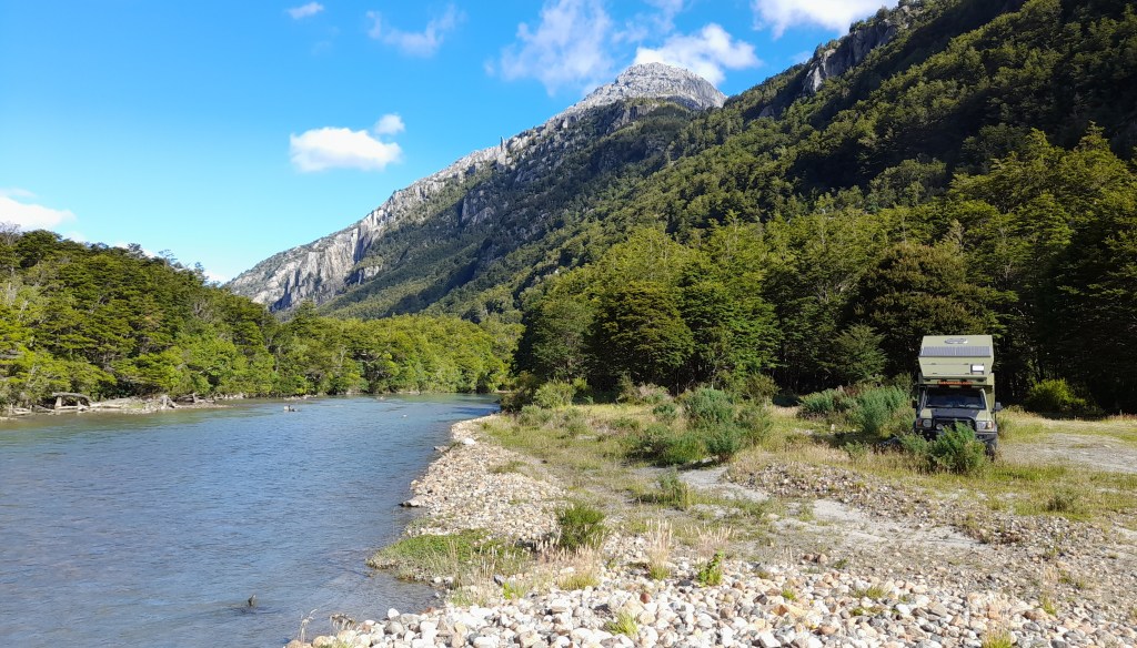 Het asfalt is op en we rijden uren over een zeer hobbelige ripio door een vallei met turquoise smeltwater en hoge puntige bergen. Kortom prachtig, maar ook vermoeiend. Aan de Rio Murta vinden we een mooie bivakplek en Jeroen kan het niet laten om even z’n hengel uit te werpen. De ambiance tussen de besneeuwde bergtoppen is magisch!
