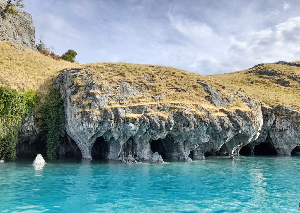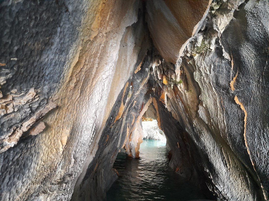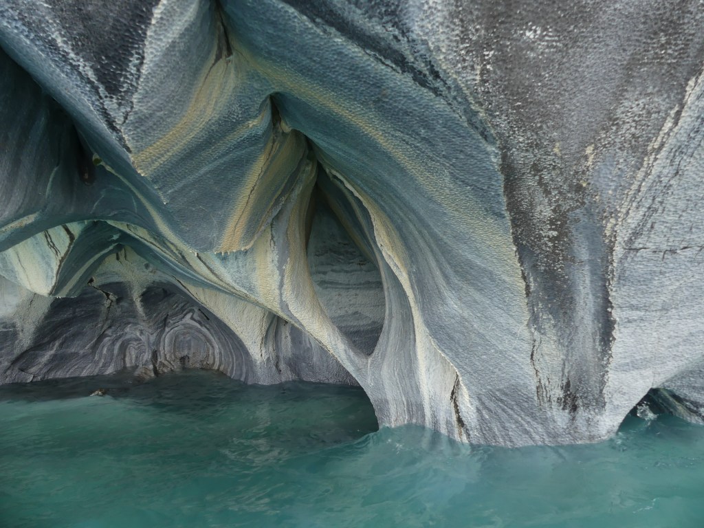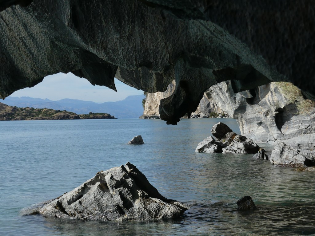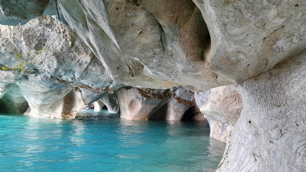 De marmergrotten die we bezoeken zijn in feite door erosie uitgesleten openingen op de waterlijn van het meer die gedurende meer dan 6000 jaar zijn gevormd. Het marmer is overwegend geelgrijs van kleur met af en toe stukken wit marmer. De vele openingen zijn soms voldoende groot en hoog genoeg om in te kunnen varen en dat is wel indrukwekkend. Eén van de grotten is wel 40 meter lang. Het zonlicht speelt met de marmerwanden in het groenblauwe heldere water. Prachtig hoor! Als laatste bezoeken we de ‘Catedral de Capilla’, een vrijstaande rots en we varen er een rondje om heen. Wederom maken we veel te veel foto’s en video’s, dus dat wordt weer uitzoeken en selecteren geblazen.