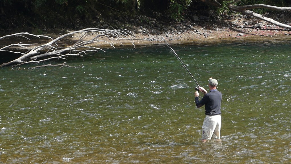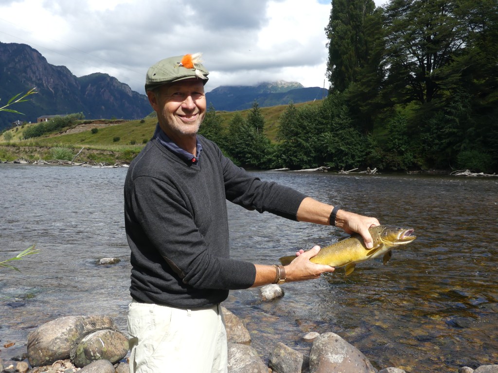 Intussen maakt Jeroen zijn hengel in orde en gaat alvast even wat proberen. Hij loopt tot z’n knieën de rivier in en werpt z’n kunstaas onder de bomen en tussen wat boomstronken. Na zo’n 10 minuten heeft hij beet, een flinke regenboogforel. Jeroen haalt de vis binnen, maar heeft geen schepnet. De vis heeft dat blijkbaar in de gaten, want begint uit het water te springen en worstelt zich los van de haak. Vis weg! Potverdorie! Opnieuw proberen, want het gekozen kunstaas spreekt aan, dat is wel duidelijk. Al snel heeft Jeroen weer een regenboogforel aan de haak en deze is veel kleiner. Jeroen kan deze netjes onthaken en zet hem weer terug. Hierna krijgt hij geen beet meer en wil ermee ophouden, want hij heeft het intussen een beetje koud gekregen. Op dat moment komt Ina even kijken met de camera in de hand en roept: “Gooi nog eens in, dan ga ik filmen”. Jeroen zoekt nog een ander plekje en werpt weer uit. Pats! Beet! Dit is weer een flinke en Ina krijgt in de gaten dat er wat aan de hand is. Jeroen haalt een prachtige bruine zalmforel (Salmo trutta fario) binnen en deze gaan we vanavond opeten met een glaasje Argentijnse witte wijn uit Cafayate.