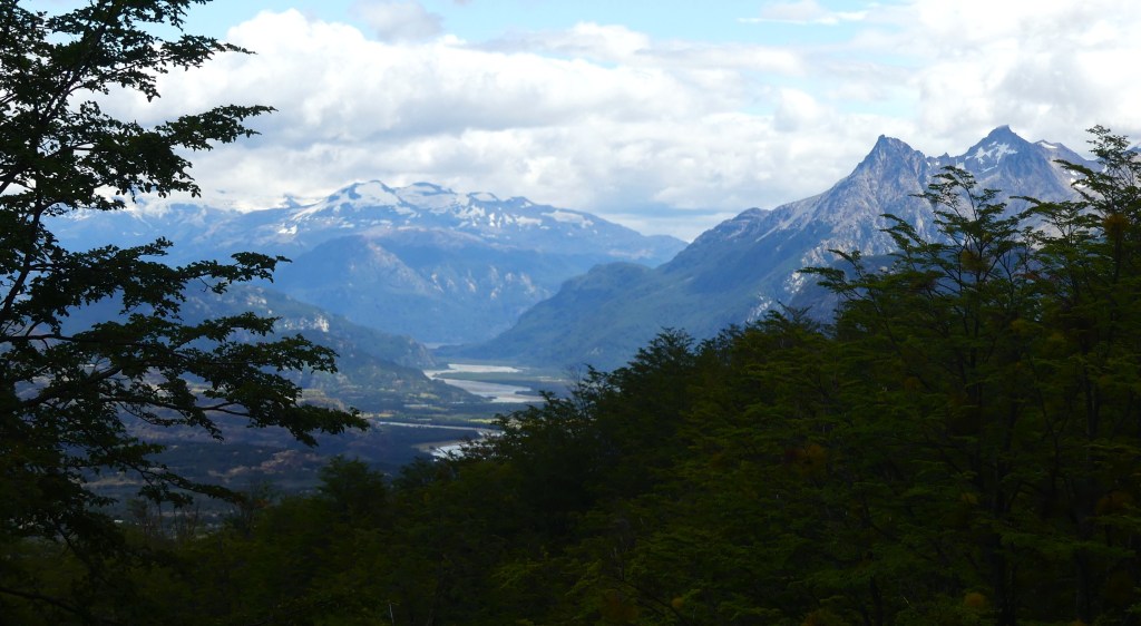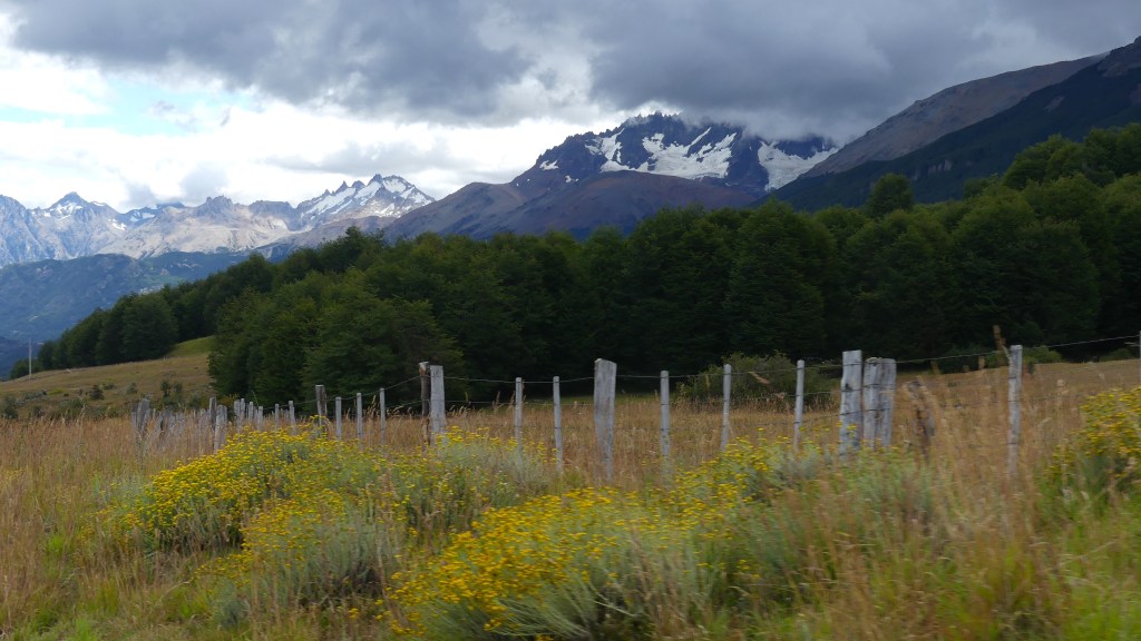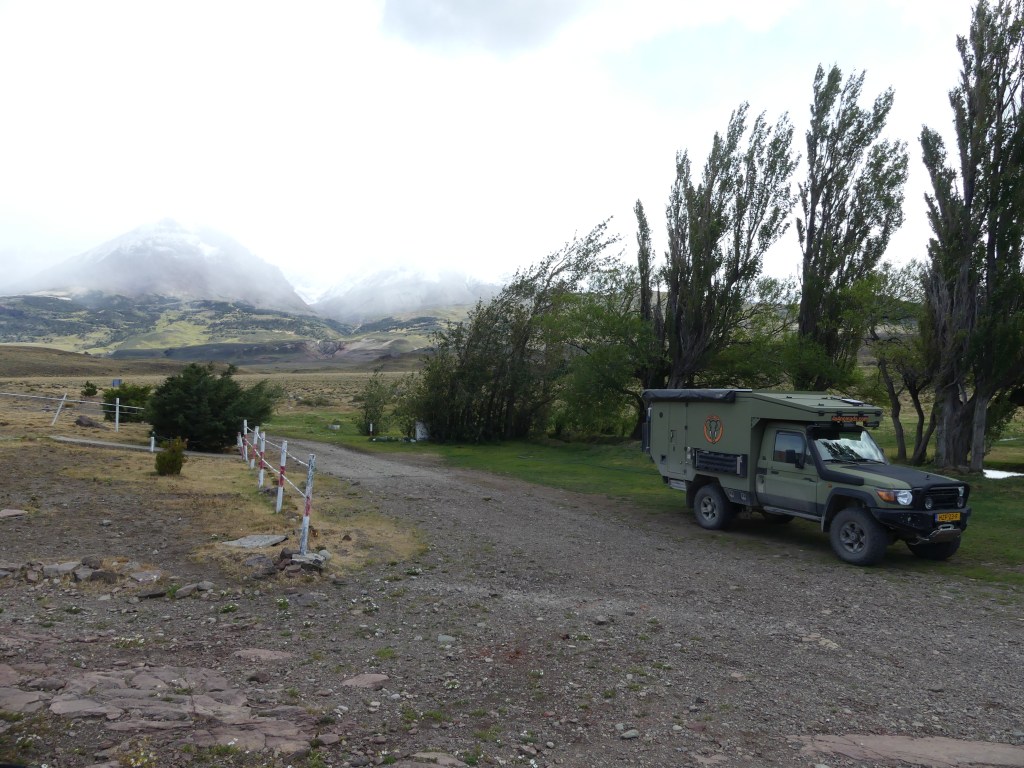 We slapen lang, mede door het geluid van de snelstromende rivier. Maar we moeten ook nog uitbuiken van de grote forel van gisteravond. We slaan het ontbijt dus maar over en rijden eerst naar Coyhaique voor boodschappen en tanken (€ 1,25/L). Om ons heen zien we steeds meer bergtoppen met sneeuw, ook wordt het kouder. We vinden het wat minder op Europa gaan lijken, alhoewel de vegetatie ons bekend voorkomt: naaldbomen, beuken, buxus, lupine en velden met margrieten en boterbloemen. Ina heeft weer een mooi koffietentje gevonden en bij ‘Cafetaria Nómades Cerro Castillo’ nuttigen we superlekkere en superdure taart, terwijl de uitbater de houtkachel aanmaakt. Ina vraagt of we over ongeveer 6 weken bij hun kunnen overnachten als we van Vuurland weer noordwaarts door Chili gaan rijden. Ze willen dat te zijner tijd bekijken, want misschien zijn ze dan al gesloten in verband met de vroege winters in dit gebied. Winter is hier trouwens alom aanwezig, gezien de markeringspalen langs de weg in geval van sneeuw, de borden met aanwijzingen naar skigebieden en de hagelbui/natte sneeuw die we onderweg op ons dak kregen.