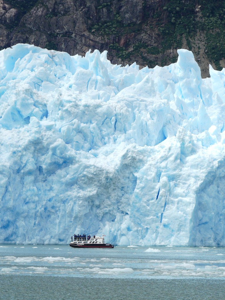 In totaal liggen er 6 boten op grote afstand van elkaar voor de enorm brede gletsjer en het toerisme vinden we aangenaam kleinschalig. De gletsjer mondt uit in de zee, maar door de grote hoeveelheid smeltwater bestaat de gehele baai uit zoet water. De kok vist een groot brok ijs uit het water, hakt daar ijsblokjes van en presenteert een borrel ‘on the rocks’. Dit ijs is ongeveer 300 jaar oud! Wij kiezen voor de Baileys met ijs en genieten met het drankje in de hand van het ongelooflijke schouwspel en de opduikende zeeluipaarden.