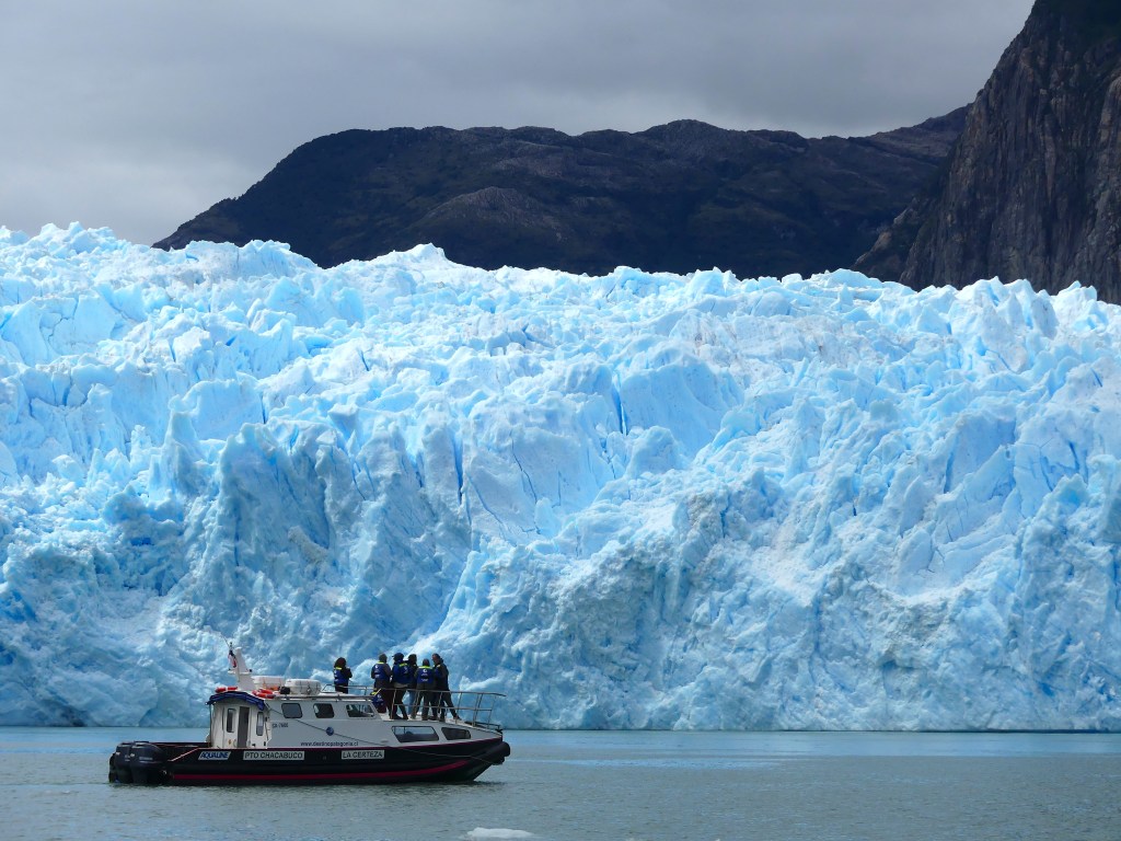 Het was een onrustige nacht op de parkeerplaats: veel verkeer en lawaaierige jongelui tot ver in de nacht. De wekker is echter onverbiddelijk, we moeten eruit want onze bootexcursie start om 8.45 uur. De groep is klein, 9 personen en dan nog de gids en de kapitein. We krijgen een zwemvest aan en scheuren in volle vaart weg over ‘Lago General Carrera’. We duiken diep weg in onze donsjacks, want het is koud in de open boot! Evenwel boffen we met het weer, want de zon komt af en toe door de wolken en de verwachte regen komt pas vanmiddag.