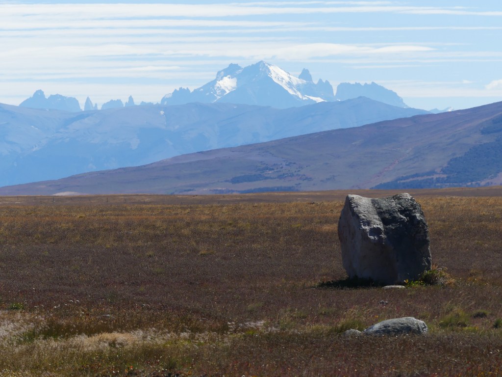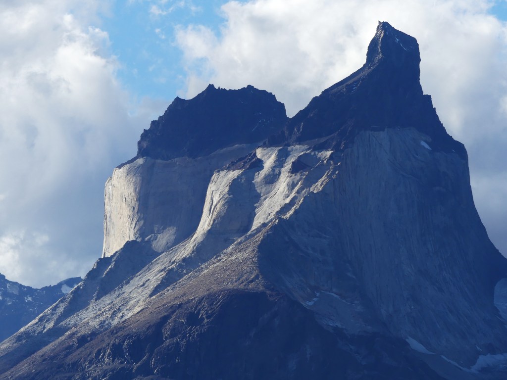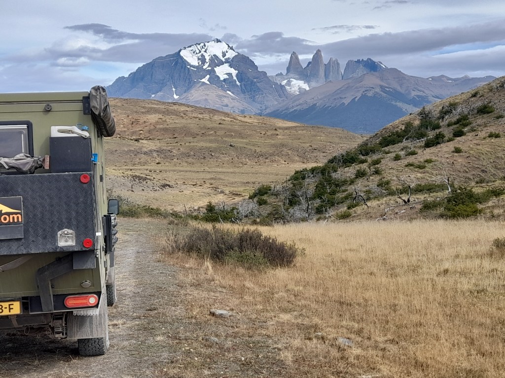 Het belooft een mooie dag te worden: bewolkt, droog en bijna geen wind, hetgeen hier in Patagonië uitzonderlijk is. We tanken nog wat drinkwater en gaan op pad. De keuze van de route is zeer beperkt. Eigenlijk kun je alleen een half rondje om het bergmassief heen rijden. Toch is het indrukwekkend genoeg. Zo zien we de ‘Torres del Paine’, drie iconische granieten torens (Torre Sur, Torre Central, Torre Norte). De naam betekent ‘Torens van het Blauwe’, waarbij ‘Torres’ Spaans is voor torens en ‘Paine’ betekent in de Tehuelche-taal blauw. Het verwijst naar de blauwe tinten van de bergen, lucht en meren. Verder zien we de ‘Cuernos del Paine’ (Cuerno Principal-Hoofdhoorn, Cuerno Norte-Noordhoorn, Cuerno Este (Oosthoorn). Cuernos betekent hoorns. Zo zien we dus de torens en de hoorns.