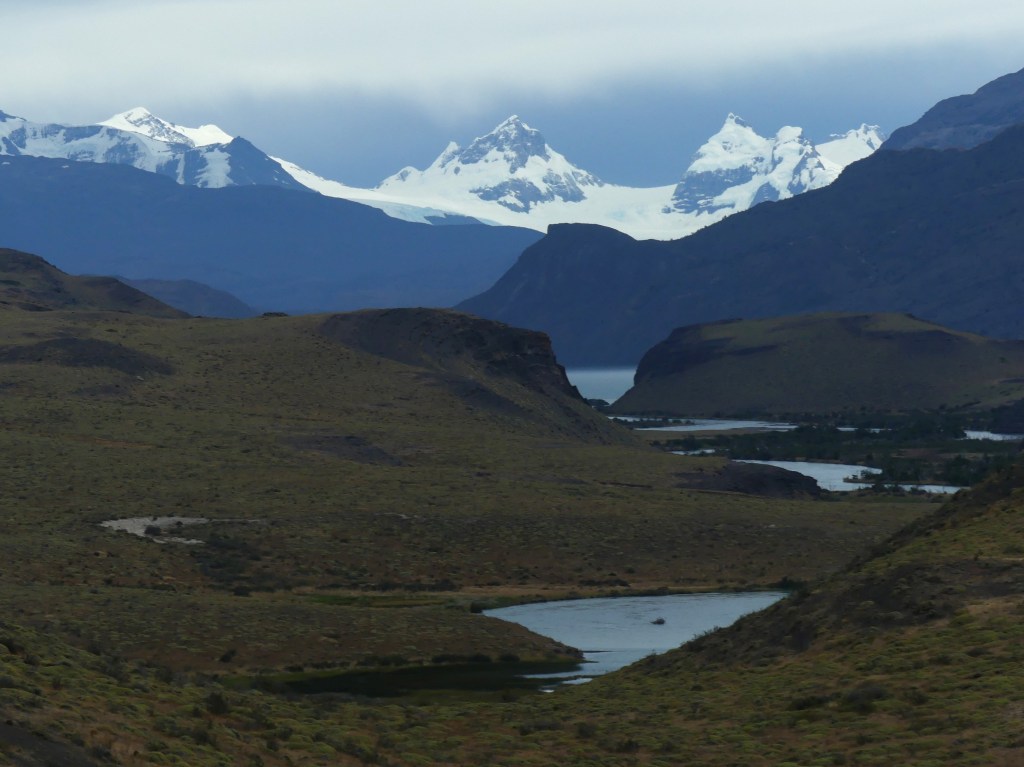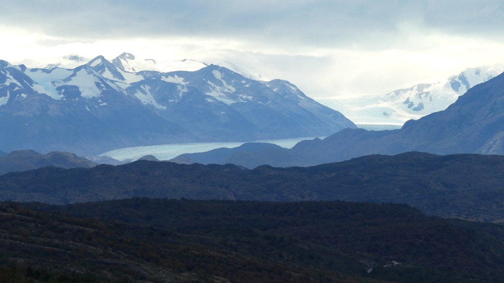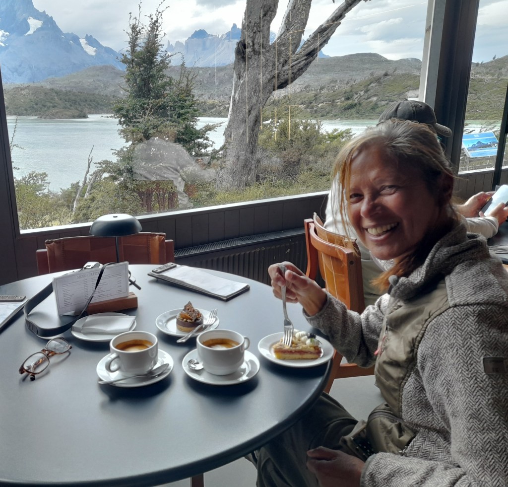 Behalve het geluid van vogels is het heel stil in het park, waardoor we pas laat wakker worden. In een verlegen zonnetje en zonder wind ontbijten we met uitzicht op de Cuernos del Paine. Niet slecht! We rijden naar het Lago Grey en we zien van ver de gletsjer in het meer uitkomen. In het zeer luxe hotel/restaurant gaan we ons te buiten aan koffie met gebak. De schade omgerekend: 33 euro! Met tip, dat dan weer wel. Best bizar en onverwachts om zo’n luxe hotel compleet met lobby, bar en restaurant in het park te zien.