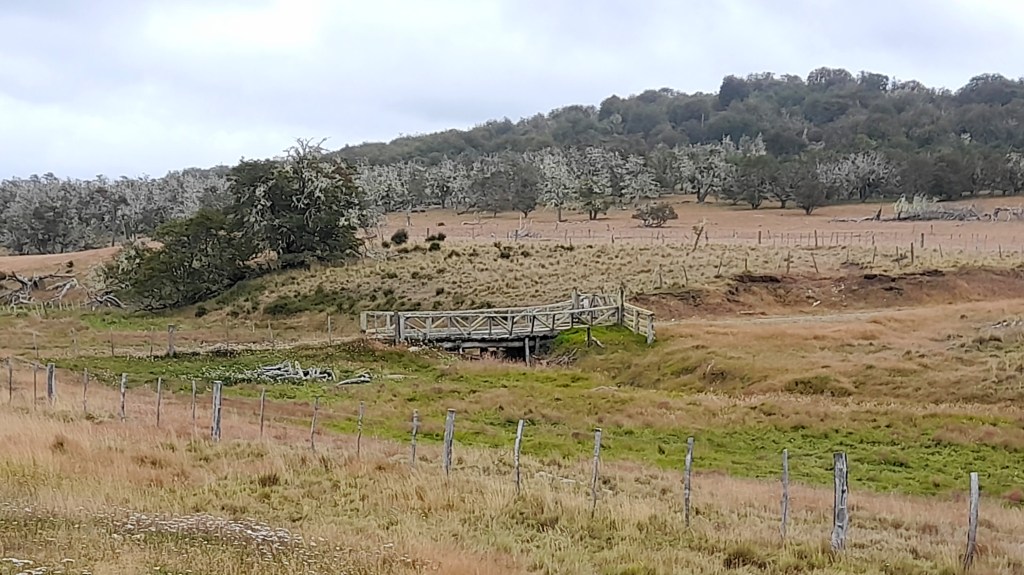 Vanaf nu rijden we noordwaarts, op weg richting Alaska. We verlaten het prachtige, momenteel zonnige natuurpark, verlaten Ushuaia en rijden over de bergpassen, zo de wazige wolkenwereld in. Helaas zien we weinig van het uitzicht, maar wel de bomen met beginnende herfstkleuren. In Tolhuin drinken we een cortado doble, omdat het daar zo lekker is, weten we nu uit ervaring. Dat geldt ook voor het gebak …. Het oorspronkelijke plan om hier op een camping te staan, laten we varen. Omdat het regent rijden we door, want dit deel hebben we op de heenweg al gezien. De laatste pesos worden omgezet in benzine en het plan is om de grens naar Chili over te gaan bij de kleine grensovergang Complejo fronterizo Río Bella Vista (ex Radman) en dan de ferry te nemen naar Punta Arenas. Ina ziet op internet een luxe estancia met mooie kamers, een lounge met open haard en gelegenheid voor vliegvissen. Daar worden we beiden enthousiast van en dat wordt ons doel vandaag. We sturen een email, krijgen geen bericht terug en een telefoonnummer staat nergens vermeld. We besluiten het erop te wagen en stellen de routeplanner in. De bergen hebben we al lang achter ons gelaten en het landschap bestaat uit glooiend grasland en is vooral heel leeg. Het is grijs, mistig en troosteloos. In de regen rijden we over een modderige en glibberige Ruta Nacional 24 Complementaria B, een ripio vol kuilen en na een uur staan we voor een afgesloten hek. “Misschien is dit de ranch en moeten we voor de lodge nog even verder” zegt Ina. Na nog eens 20 minuten staan we weer voor een hek, deze kan open en we gaan er doorheen om na een aantal kilometers alsnog stil te staan voor een afgesloten hek. We geven het op, het wordt al laat en we zijn moe. Ergens een bivakplek vinden is niet eenvoudig, de ripio heeft aan beide zijden een diepe greppel waar regenwater in staat en verder zijn er overal hekken. De grens met Chili blijkt dichtbij en we gaan proberen daar te overnachten. De grensbeambte begrijpt onze bedoeling, maar wil ons verder weg hebben van de slagbomen en gebaart naar de achter ons liggende velden. Dáár ergens, lijkt hij te zeggen. Jeroen rijdt een heel stuk achteruit, want de weg is best smal om te keren en de bermen zijn doorweekt. Uiteindelijk vinden we een verbreding naast de weg met harde ondergrond en we installeren ons. Kacheltje aan, borreltje met chips en net als we willen gaan koken, komen er 2 grensbewakers op een quad ons duidelijk maken dat we hier niet mogen staan, te gevaarlijk met dit weer zo langs de weg. “Rijden er hier ’s nachts dan ook auto’s?”, vraagt Ina verbaasd. De man knikt bevestigend. De hele dag hebben we geen andere auto gezien, maar goed, we pakken alles weer in en volgen de quad terug naar de slagbomen. Nu mogen we hier ineens wel gaan staan en we proberen het maar niet te begrijpen. Gelukkig zijn we goed op elkaar ingespeeld en in no time zitten we er weer warm en knus bij. Morgen maar bekijken hoe we verder gaan.