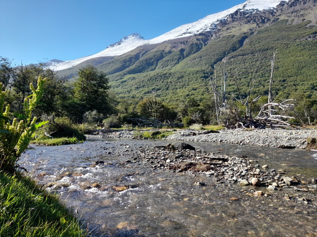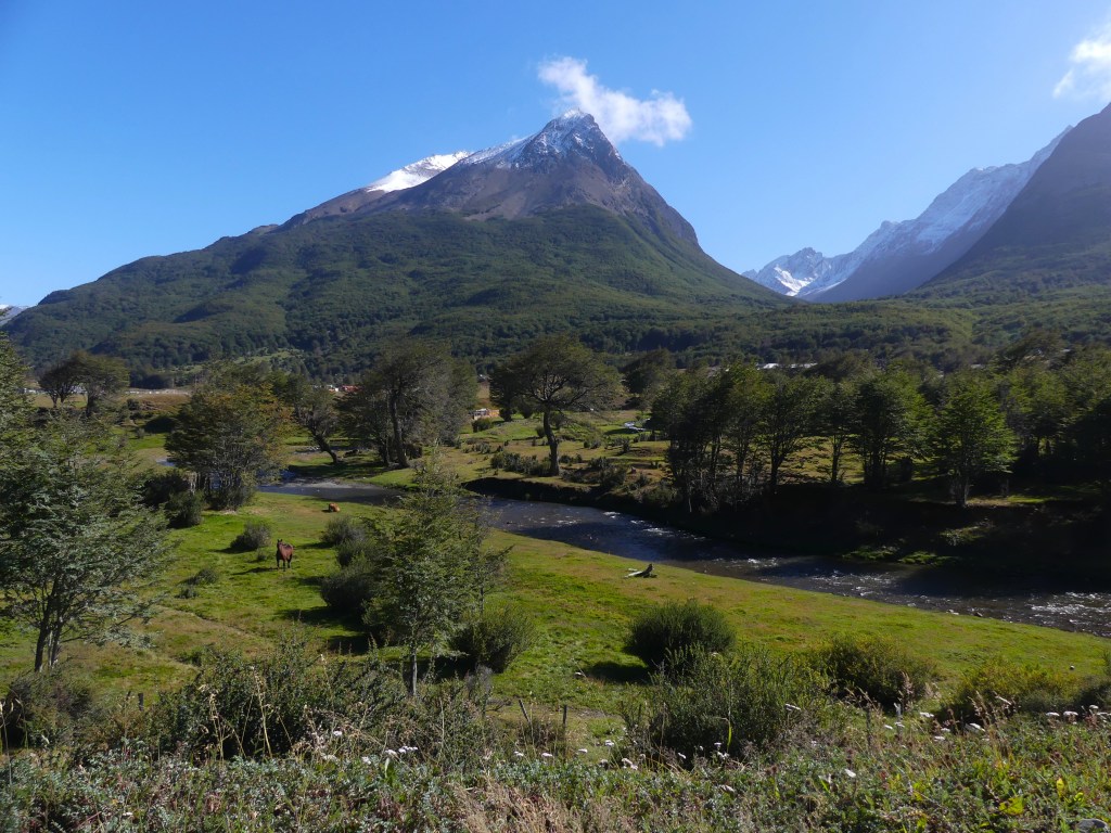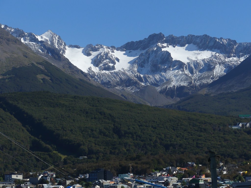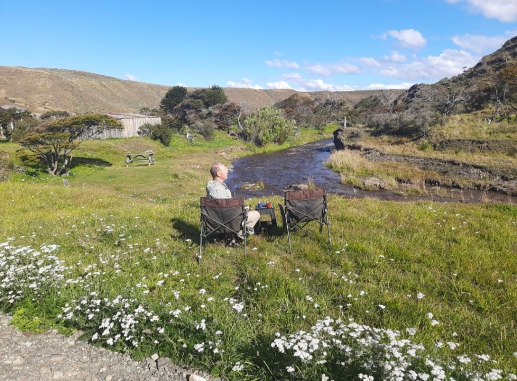 De komende dagen wordt het zonnig weer en dus gaan we op pad. Nu pas kunnen we de gletsjer Glaciar Martial in vol ornaat zien. Mooi hoor, hij torent boven de stad uit. Ten westen van Ushuaia ligt het Parque Nacional Tierra del Fuego wat we graag willen verkennen. Eerst nog tanken en enkele boodschappen doen, want in het natuurpark is geen enkele winkel of restaurant. De rit naar de ingang van het park duurt een half uur. Daar laten we onze entreepas zien en tevens registreren we ons via een onlineformulier. We rijden vervolgens een ripio langs de rivier Rio Pipo, hetgeen de fraaie zin “We rijden op de ripio Rio Pipo” oplevert. We zijn verrast door het bergachtige landschap hier in het zuiden van Vuurland. De bergen om ons heen zijn slechts zo’n 1100 m hoog, maar doen imposant aan. Al gauw vinden we een mooie plek waar we uitkijken op de besneeuwde toppen. De stoelen zetten we buiten en behalve even naar de Río Pipo lopen, doen we verder bijna niets anders dan opwarmen in de zon. Jeroen vervangt nog de schroeven van de Starlink door roestvrije schroeven, meegenomen door Senno en Marjanne uit Nederland.