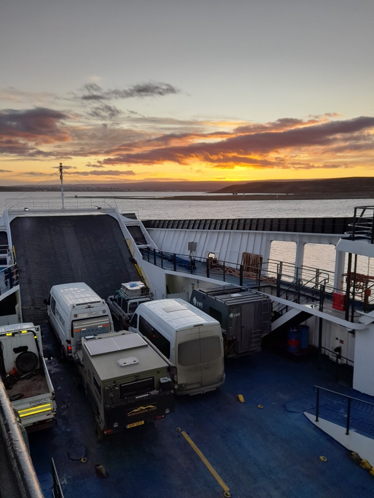 Het is weer eens vrijdag de 13e. Bij de boeking voor de oversteek naar Punta Arenas met de ferry moesten we een contactpersoon opgeven. Dat kan handig zijn bij een eventuele schipbreuk en we hebben Roy, de broer van Ina opgegeven. Tja, je weet het nooit op zo’n vrijdag de 13de. Zoals beschreven in de voorwaarden moeten wij ons om 07.00 uur melden. Dus vroeg op en zonder ontbijt rijden we de 100 meter naar de ferry. “U moet eerst uw tickets laten printen,” zegt de ferrymedewerker en hij wijst naar het kantoortje naast de auto. Jeroen doet braaf wat hem wordt gezegd, komt terug, neemt plaats achter het stuur en overhandigt de printjes aan de man. “Nu moet u naar de controlepost mèt de printjes. Dat is dáár!” Hij maakt grote armgebaren en we rijden een rondje van ruim 500 meter terug. Een andere medewerker met portofoon neemt de printjes in, wijst waar we moeten parkeren en wachten op zijn sein om naar de ferry te mogen rijden. Alles gaat zeer gecontroleerd. Tja, zo kan het ook. Na 5 minuten kunnen we naar de boot. Jeroen rijdt de auto op de ferry en we werpen een blik naar het oosten. Wat mooi om zo vroeg de zonsopgang te zien. Zouden we vaker kunnen doen. Binnen vinden we een plekje om ons ontbijt te nuttigen. De rustige tocht over de Straat van Magellaan duurt twee uur. Wanneer we aan land zijn, melden we aan Roy dat we veilig zijn gearriveerd.