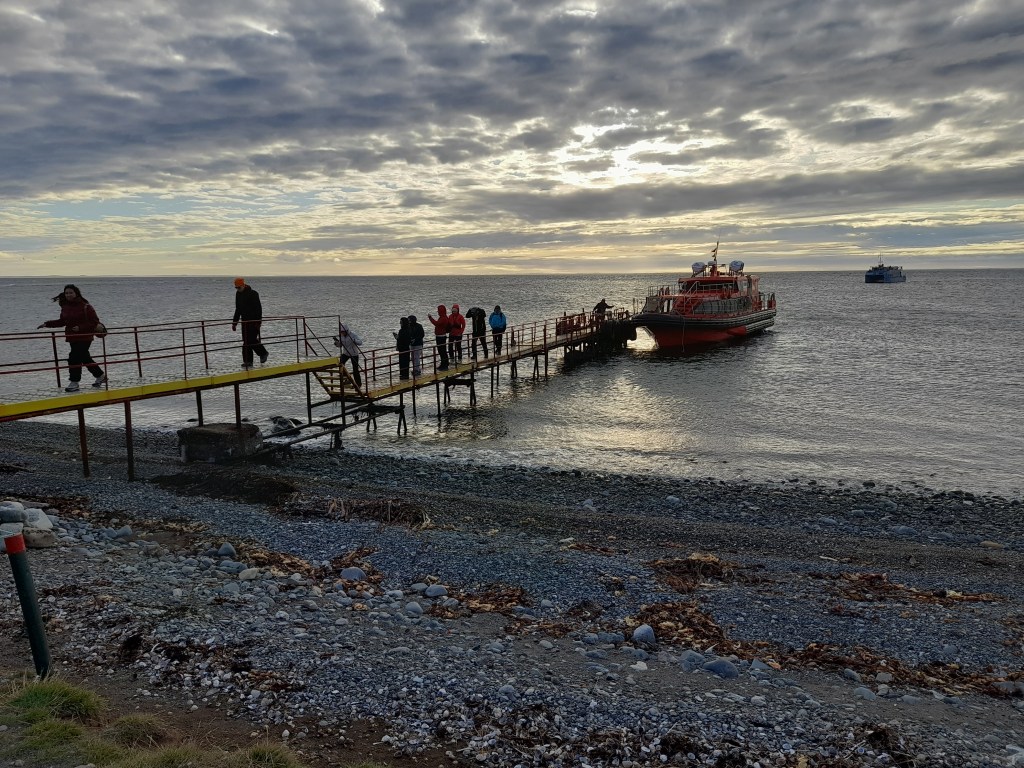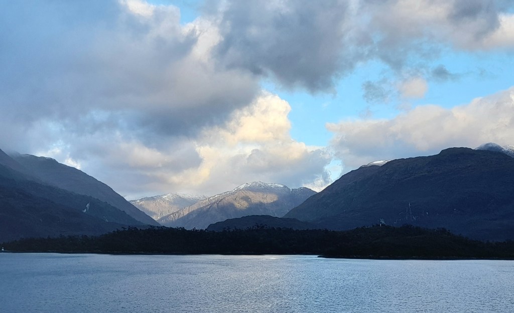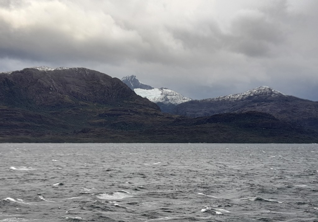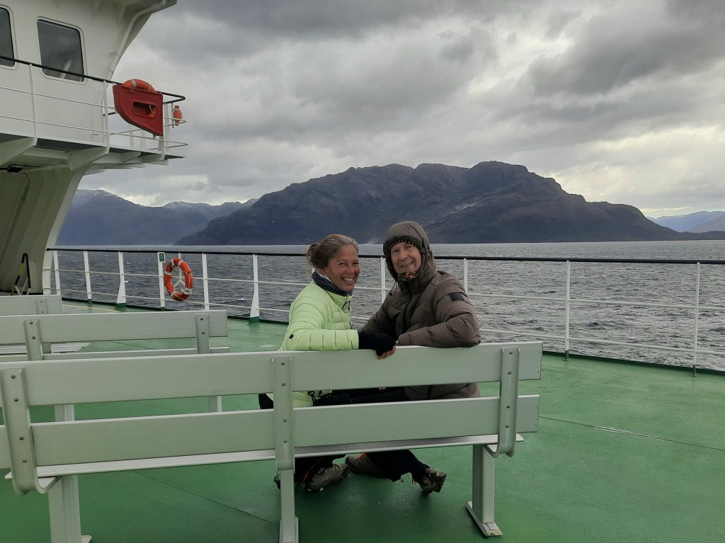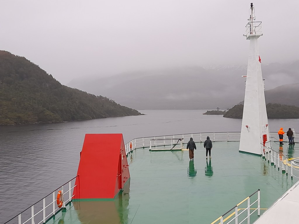 Leven voor een paar dagen op de boot bevalt ons prima dankzij de vriendelijke en behulpzame crew. De eerste nacht hebben we goed geslapen, worden we voor het ontbijt wakker, zien we dat de boot nog maar net is vertrokken en aanschouwen we de zonsopkomst achter Puerto Natales. Op de grote ferry kunnen we letterlijk rondwandelen op het dek of vertoeven in de goed verwarmde ruimtes. Er liggen boeken en spelletjes waar de gasten gebruik van kunnen maken. De crew heeft dagelijks zowaar een gevuld programma. We beginnen met het ontbijt van 08.00 tot 09.00 uur, daarna kunnen we de hele dag gratis aan de thee, koffie of limonade. Tijdens het ontbijt ontmoeten we de Nederlandse Overlanders Justine en Wijnand die rondreizen in een Toyota 4Runner met daktent. De gebruikelijke ‘gluren-bij-de-buren-activiteit’ laten we achterwege, want we mogen tijdens de boottrip niet naar de auto. Wel beantwoorden we elkaars vragen die beginnen met hoe, wat, wanneer, waar, hoe lang. Het ‘waarom’ is niet belangrijk, want elke Overlander begrijpt waarom we reizen. Ina raakt aan de praat met de jonge Chileen Louis die met zijn hond Kimal reist en veel over Chili weet te vertellen. Dan klinkt een mededeling door de boxen. Op deze route zal de boot door de smalste doorgang varen, ‘Canal Kirke’. Helaas is het grauw en grijs weer, waait het en valt er regen, maar iedereen heeft zich goed voorbereid gezien de kleding die men draagt. Toch kunnen we voldoende zien en hangt er door de laaghangende bewolking een mysterieuze sfeer. Het doet ons denken aan de boottocht in ‘Doubtful Sound’ op het zuidereiland van Nieuw Zeeland onder dezelfde weersomstandigheden.