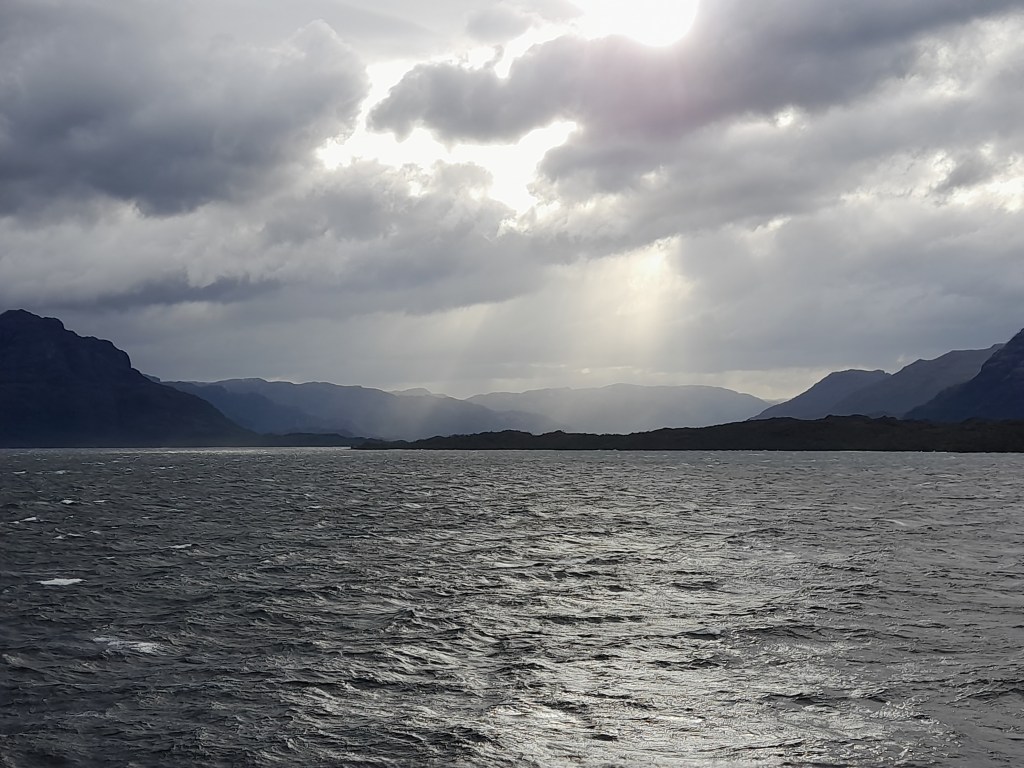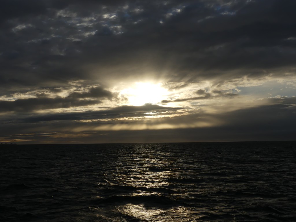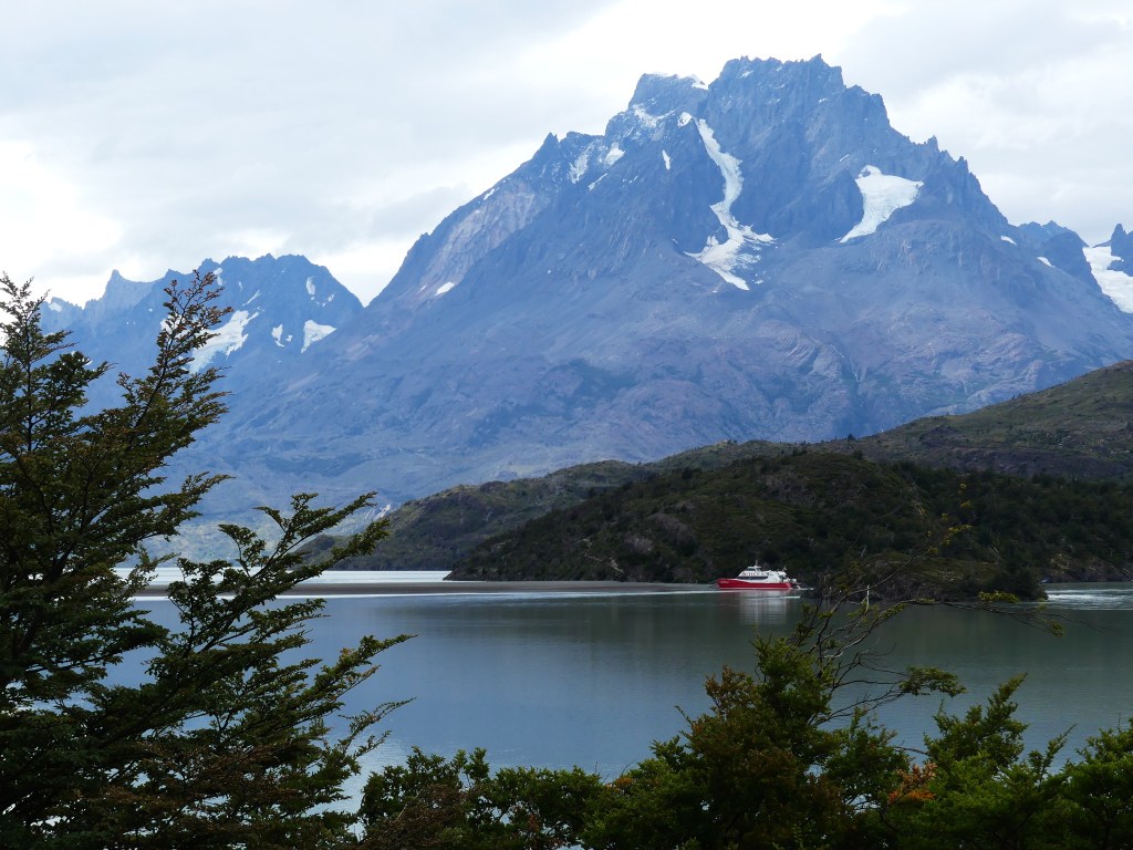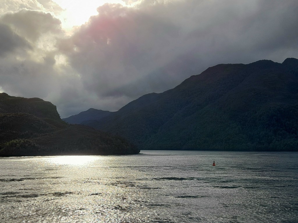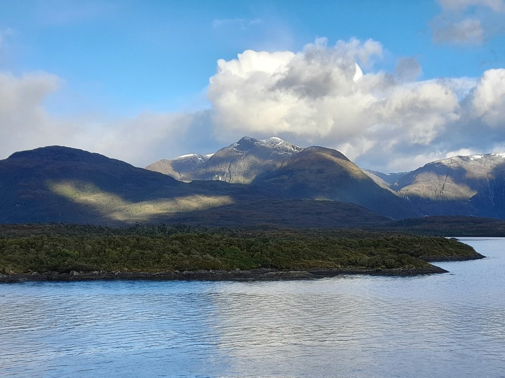 Leven voor een paar dagen op de boot bevalt ons prima dankzij de vriendelijke en behulpzame crew. De eerste nacht hebben we goed geslapen, worden we voor het ontbijt wakker, zien we dat de boot nog maar net is vertrokken en aanschouwen we de zonsopkomst achter Puerto Natales. Op de grote ferry kunnen we letterlijk rondwandelen op het dek of vertoeven in de goed verwarmde ruimtes. Er liggen boeken en spelletjes waar de gasten gebruik van kunnen maken. De crew heeft dagelijks zowaar een gevuld programma. We beginnen met het ontbijt van 08.00 tot 09.00 uur, daarna kunnen we de hele dag gratis aan de thee, koffie of limonade. Tijdens het ontbijt ontmoeten we de Nederlandse Overlanders Justine en Wijnand die rondreizen in een Toyota 4Runner met daktent. De gebruikelijke ‘gluren-bij-de-buren-activiteit’ laten we achterwege, want we mogen tijdens de boottrip niet naar de auto. Wel beantwoorden we elkaars vragen die beginnen met hoe, wat, wanneer, waar, hoe lang. Het ‘waarom’ is niet belangrijk, want elke Overlander begrijpt waarom we reizen. Ina raakt aan de praat met de jonge Chileen Louis die met zijn hond Kimal reist en veel over Chili weet te vertellen. Dan klinkt een mededeling door de boxen. Op deze route zal de boot door de smalste doorgang varen, ‘Canal Kirke’. Helaas is het grauw en grijs weer, waait het en valt er regen, maar iedereen heeft zich goed voorbereid gezien de kleding die men draagt. Toch kunnen we voldoende zien en hangt er door de laaghangende bewolking een mysterieuze sfeer. Het doet ons denken aan de boottocht in ‘Doubtful Sound’ op het zuidereiland van Nieuw Zeeland onder dezelfde weersomstandigheden.