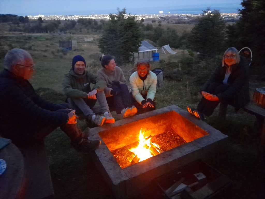 Dan spot de gids een walvis. Terwijl iedereen richting zijn wijzende vinger kijkt, ziet Jeroen aan de andere kant van de boot een spuitende walvis en hij ziet zijn rugvin in de zee verdwijnen. En daarna zien we geen spoor meer van deze indrukwekkende jongens. Eenmaal terug in Punta Arenas gaan we echte koffie drinken, doen nog boodschappen en pinnen wat pesos. Het weer is aangenaam, half bewolkt en weinig wind. Ideale omstandigheden om ons composttoilet weer eens een grote beurt te geven. Fabiola vindt dit zeer interessant, we leggen de werking uit en geven haar twee blokken van de geperste kokosvezels, want ze wil ermee experimenteren met de opgeruimde hondenpoep op het terrein. Eindelijk gaan we weer eens asado eten en Jeroen maakt een vuurtje van afvalhout dat we krijgen van Fabiola en ze geeft ons zelfs een fles wijn. We eten samen met Hollanders Dave en Carlijn en de Fransen Veronique en Patrick. Heel gezellig!