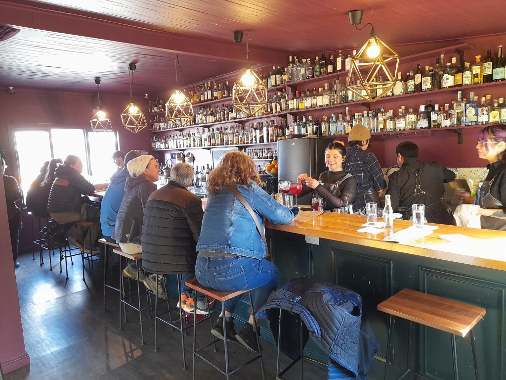 In de middag rijden we naar het toeristische Puerto Natales, een kleine plaats, sfeervol, met veel hotels/hostels, restaurants, koffiebars, gekleurde huizen en natuurlijk een kerk. We gaan een gin-distilleerderij bezoeken en een rondleiding volgen. De distilleerderij heet ‘The Last Hope’. De naam heeft niets te maken met ‘Desperate to find gin in the far south’. Wat dan wel? De Spaanse zeevaarder Juan Ladrillero verkende in 1557 de kust om een doorvaart via de Straat van Magellaan vanuit het westen te vinden. Nadat hij in talrijke kanaallabyrinten was gestrand, noemde hij deze inham “Ultima Esperanza”, omdat dit zijn laatste kans was om de doorgang te vinden voordat hij moest omkeren. Vandaar de naam. Wat we vooraf niet weten, is dat de Engelse rondleiding begon om 17.30 uur. Daar zijn we helaas te laat voor. Natuurlijk drinken we een gin-cocktail en daarna opteren we voor de Spaanse rondleiding. Matthew, de Engels- en Spaanssprekende gids, raadt het ons pertinent af omdat we geen Spaans spreken, de uitleg niet begrijpen en waarschijnlijk ook zijn grappen niet, maar wij zijn lekker eigenwijs. “Het lijkt ons een heel goed idee om ons Spaans te oefenen”, zegt Jeroen met een grote glimlach. “Okay, whatever. I’ve warned you!”, krijgen we als antwoord.