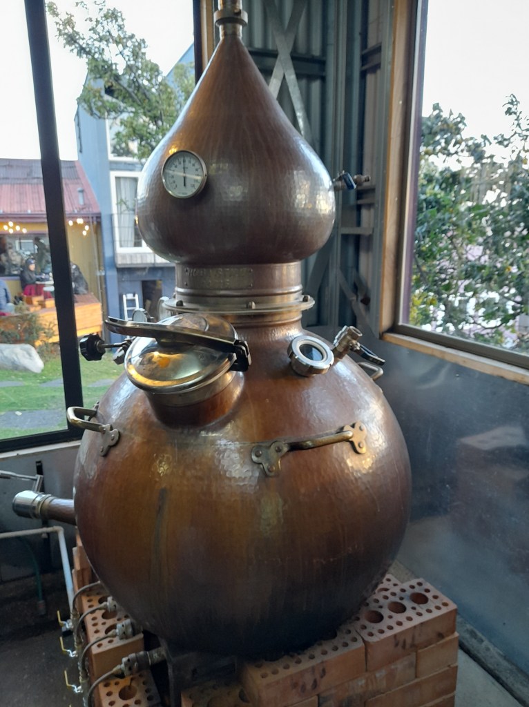 Verrassend genoeg begrijpen we veel van zijn uitleg, waarschijnlijk ook omdat we Frans spreken. Halverwege vraagt Matthew ons: “Do you understand it? Also the nonsense jokes? You understand about 20%?” Welnee, veel meer dan dat. “Ik heb alles opgenomen om het te vertalen”, grapt Ina….. Dry gin wordt gestookt van bessen en kruiden, zoals onder andere jeneverbes, steranijs, kaneel en kardemom. De variant met de Calafatebes wordt verkregen door deze bessen in de dry gin te weken. De gin rijpt vervolgens enkele maanden in eikenhouten vaten. We verlaten de distilleerderij met twee flessen gin, een Dry gin en een Calafate gin. In een restaurant eten we heerlijk voordat we terug rijden naar ons onderkomen.