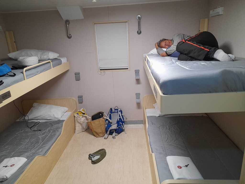 Klopklopklop! Wakker worden! We worden het bed uitgebonjourd. De schoonmakers staan voor de deur en we kunnen nog een half uur ontbijten. Dat doen we met Justine en Wijnand. Gezellig! Opeens zien we de boot 180° draaien en we kijken elkaar verbaasd aan. Uit de luidsprekers horen we dat de kapitein om 10 uur een mededeling zal doen over het weer en het vervolg van de boottrip. We verstaan het niet helemaal, maar het klinkt niet al te hoopvol. “We zullen toch niet terugvaren?”, vraagt Wijnand. We gaan het straks horen. Eerst maar uitwaaien op het dek. De temperatuur is goed en ondanks de laaghangende bewolking kunnen we de toppen van de heuvels en bergen zien en zelfs de gletsjers. Als enige gasten nemen we plaats op een bank om te genieten van het panorama. Door het natuurschoon vergeten we de tijd en zijn we te laat voor de mededeling. Niet erg, want al gauw horen we dat we heen en weer zullen varen totdat verderop de golven minder dan 4 meter hoog zijn. De vertraging wordt vast en zeker met een dag (of langer ….) verlengd, schatten we in. Hopelijk weet het team ons te blijven vermaken met een passend animatieprogramma. Want het bekende gezegde ‘gasten en vis blijven drie dagen fris’ wordt zo langzamerhand wel van toepassing, hoewel we er gelukkig (nog) niets van merken. Iedereen is nog happy en relaxt. En anders kan Jeroen altijd nog een ‘tiny house gitaarconcert’ geven, oppert Ina. ’s Avonds kijken we naar de documentaire ‘Our Oceans, Pacific Ocean’. Prachtig gefilmd.