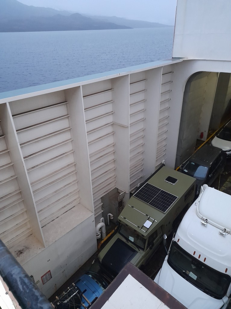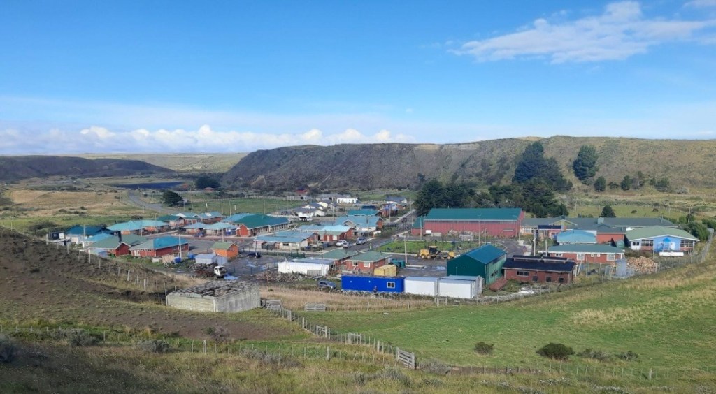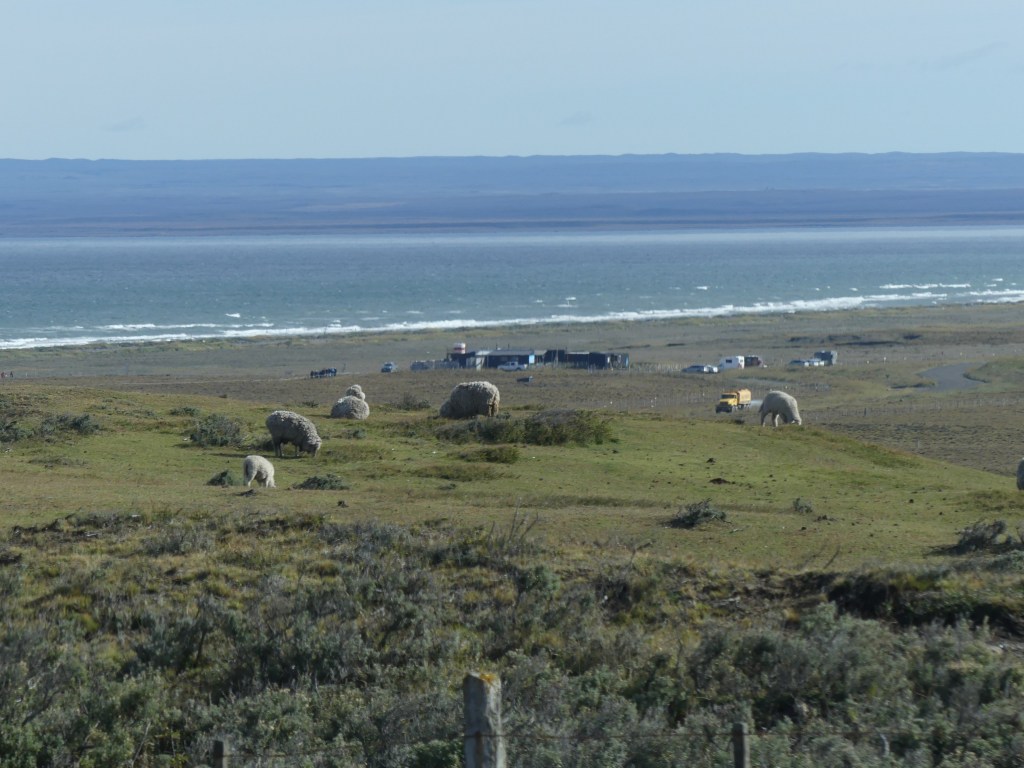 We rijden de paar kilometer niemandsland terug en lopen naar de verbaasd kijkende Chileense medewerkers. Ze lachen als ze ons verhaal horen en met een glimlach maken ze de formulieren in orde. Stempel in het paspoort, we krijgen een nieuwe TIP en we moeten het SAG-formulier invullen. De SAG-beambte is niet gevoelig voor onze uitleg dat we feitelijk niet in Argentinië zijn geweest en hij controleert zelfs of we geen verse etenswaren vervoeren. Enfin, we kunnen weer door. De route vinden we niet bijzonder, het is vooral licht glooiende pampa. Wel zijn we blij met de goed begaanbare weg en we ‘vliegen’ naar de ferry bij Punta Delgada. Er staat al een flinke rij vrachtwagens en auto’s te wachten en we sluiten aan. We hebben geluk, want de ferry komt net aan en na een kwartiertje wachten kunnen we de boot op. De oversteek duurt een halfuur en we zijn even lekker uitgewaaid. We zijn door de oversteek op Tierra del Fuerto aangekomen, ofwel Vuurland. Dat vinden we wel een mijlpaal en de stemming zit er goed in. Ina heeft op iOverlander gelezen dat we bij het dorp Cerro Sombrero kunnen overnachten als we gaan eten in ‘Creativa Hotel/Restaurant’. De eigenaar verwelkomt ons hartelijk, we eten er heerlijk en mogen zonder probleem een plekje uit de wind zoeken op de grote parkeerplaats tussen de containers.