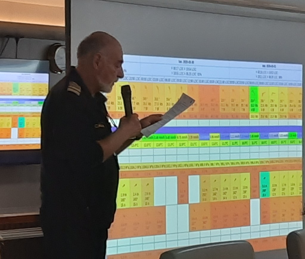 “We need four”, aldus el capitán die een update geeft via een niet functionerende microfoon. Iedereen hangt aan zijn lippen, maar op de ‘Windy-app’ die de kapitein ons op het grote scherm laat zien, hebben we al voor ons vertrek ontdekt dat de weersverwachtingen dramatisch zijn voor de komende dagen. “We need four” slaat op de golven die niet hoger mogen zijn dan 4 meter om veilig te varen, met name op open zee bij de ‘Golf de Peñas’. Volgens ‘Windy’ zullen de golven niet eerder dan vrijdag lager zijn voor een veilige tocht. Dat is pas over 5 dagen! We gaan niet terug naar Puerto Natales en we mogen niet van boord voor een excursie naar het dorp of een hike over de heuvels, wat wij wel leuk hadden gevonden. Tenslotte eindigt de kapitein met de opbeurende opmerking dat deze weersomstandigheid zelden voorkomt en we dus geluk hebben. De sfeer is nog steeds ok, mensen leren elkaar beter kennen en zo te zien ondergaat iedereen het gelaten. Hoe we de tijd doorkomen? Daar zal het animatieteam zich over buigen, denken we.