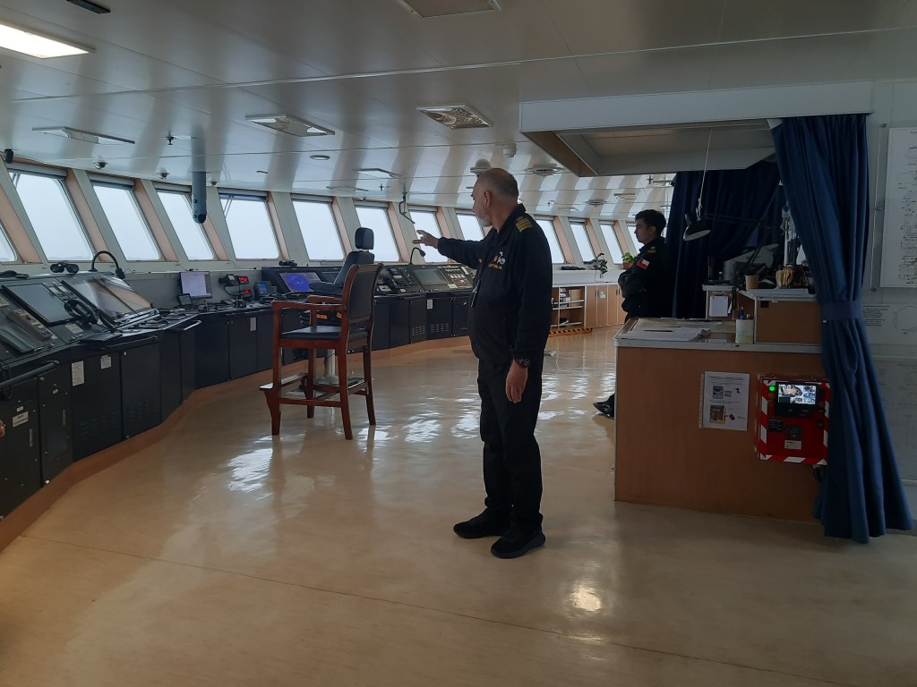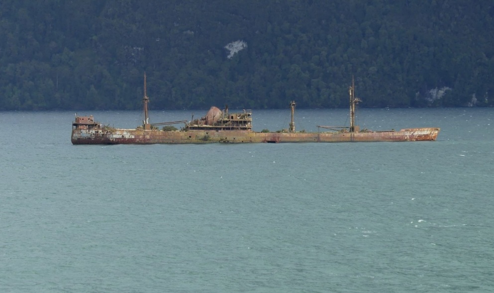 Met een strakblauwe lucht, zon en een regenboog verlaten we Puerto Edén en nu zien we pas hoe mooi het is met gletsjers en besneeuwde toppen. Het eerstvolgende toeristische punt is de ‘Angostura Inglesa’, de nauwe Engelse doorgang. Gisteren mochten we een kijkje nemen in het domein van El Capitan. We zagen de grote schermen voor de digitale navigatie. De kapitein vertelde dat er verhalen de ronde gaan dat een schip in de toekomst kan worden bestuurd door apen, maar wie denkt eraan om de apen eten te geven? Ai, essentieel detail. Digitale navigatie is een belangrijk hulpmiddel, maar nog steeds zijn kompas, kaarten en logboek nog heel relevant. Knap om op de boeg te zien hoe het grote gevaarte door de nauwe doorgang van ‘Canal Messier’ vaart. Al gauw arriveren we bij de volgende toeristische attractie, Shipwreck Capitán Leonidas. Op 7 april 1968 strandde het Griekse schip beladen met suiker waarschijnlijk opzettelijk op een rif vanwege verzekeringsfraude, echter dit is nooit bewezen. De suiker is verkocht, het wrak ‘Capitán Leonidas’ ligt nog steeds op het Bajo Cotopaxi-rif en fungeert nu als een bekend herkenningspunt, baken en duiklocatie. Justine en Wijnand mogen met hun drone een opname maken. Ze hebben een fantastische film gemaakt en met ons gedeeld. Alle credits voor hen. Hartelijk bedankt voor het delen. ’s Middags spelen we met zijn vieren het kaartspel ‘toepen’. Justine leest de regels voor, want het is zeker 40 jaar geleden dat we het hebben gespeeld. Het blufelement is een grappig element in het spel waar regelmatig, meestal zonder succes, gebruik van wordt gemaakt. ’s Avonds om 21.00 uur staat ons weer een programma te wachten, alleen zijn we zelf het animatieteam. Karaoke! Zuiver zingen is niet belangrijk, meedoen werkt sfeerverhogend en inderdaad, het is een gezellige, dolle boel. Om 22.00 uur lezen we de mededeling van de kapitein dat we gaan varen door de Golf van Peñas. “We have four!” Uit veiligheid mag niemand op het dek komen vanwege de golven en de wind. Hopelijk kunnen we slapen door het harde gebonk van de boot op de golven en het gekraak van de kasten in de hut. Dat nemen we op de koop toe want de Sailor sails on!