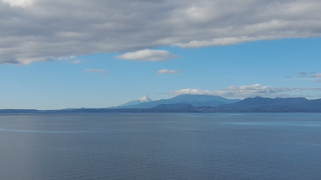 Eindelijk komen we na zeven dagen aan in Puerto Montt. We worden er blij van en verlangen naar ons eigen mobiele huisje waar we al 16 nachten niet hebben geslapen. We hebben een meevaller. Vandaag gaan we in Puerto Montt al om 21.00 uur van boord in plaats van na middernacht. Tijdens de lunch klinkt hard uit de speakers: “Whales Whales!” Het is grappig om te zien dat bijna iedereen zich haast richting stuurboord. In de verte zien we met moeite een paar vinnen en het puffen van de walvissen. En dat was het, blij gemaakt met een half dode mus. Niet getreurd. Wij vestigen onze hoop op Vancouver in Canada om ze daar te spotten. Dat zal niet eerder dan 2028 zijn, maar dan heb je ook wat om naar uit te kijken. De boot vaart op volle toeren en komt al dichter bij de eindbestemming. Opeens zien we de vulkaan ‘Osorno’ achter een berg tevoorschijn komen. Deze vulkaan heeft de vorm van een kegel, is ruim 2600 m hoog en er ligt altijd sneeuw op de top. Het lijkt de Fuji wel. Dit weekend zullen we de Osorno van dichtbij aanschouwen. De boot vaart zo snel dat we Puerto Montt al rond 19.00 uur bereiken. In de haven zien we meeuwen, aalscholvers, zeeotters en zeeleeuwen op de boei. De boot moet 180° draaien zodat de auto’s en vrachtwagens de kade op kunnen rijden. Onder toeziend oog van el capitán schieten duwboten te hulp en met een half uur is de klus geklaard. We kunnen vertrekken met de Tembo Toy. Eerst nemen we afscheid van Louis en daarna van Justine en Wijnand. Bedankt voor de gezelligheid tijdens de maaltijden en het kaartspel ‘toepen’. Wie weet, ontmoeten we elkaar nog ergens in het noorden.