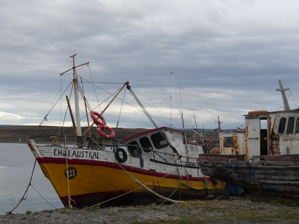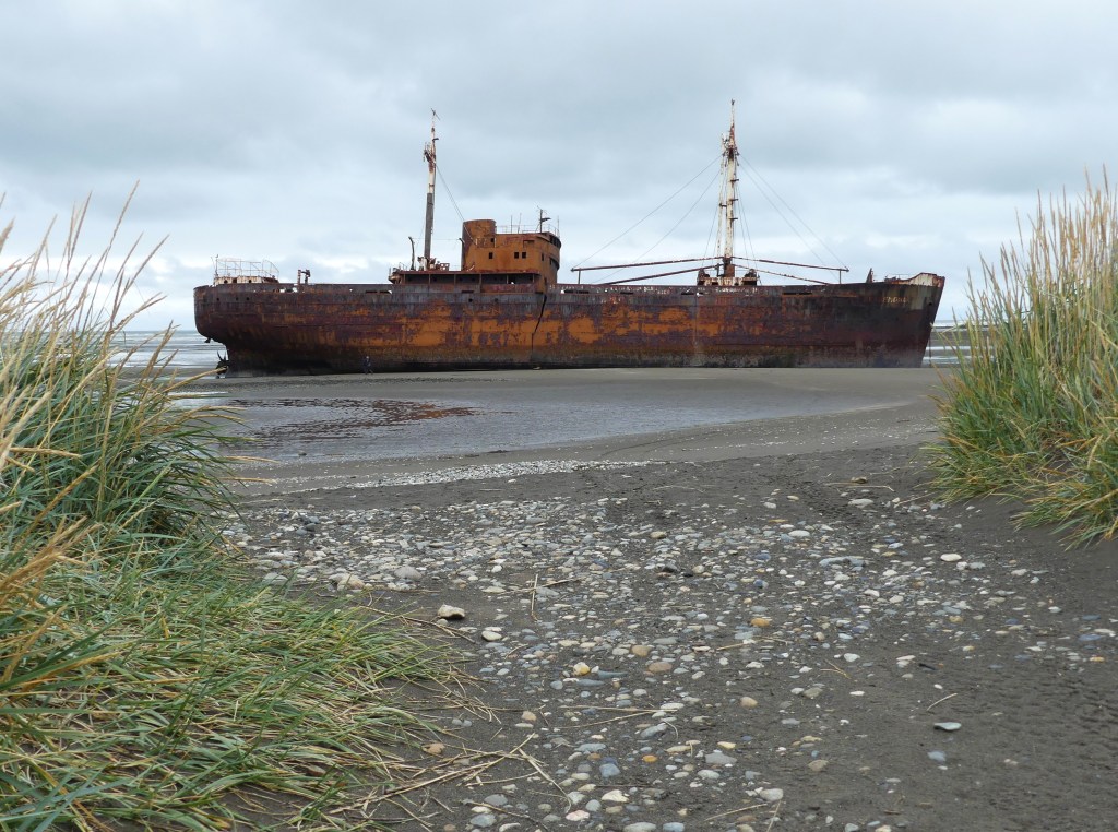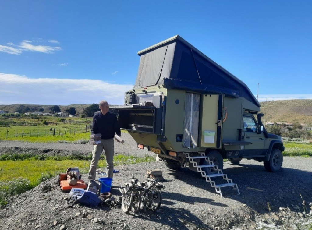 We blijven een dagje op de zeer eenvoudige camping aan zee. Het is koud, regenachtig en het waait. Tja, wat kan je anders verwachten zo zuidelijk. Redenen genoeg om de isolatiematten uit te proberen die Ina voor deze reis op maat heeft gemaakt. Alles past en werkt, we merken het verschil direct. Als het even droog is, lopen we het strand op en gaan de in 1985 aangespoelde Desdemona bekijken. De romp verroest in prachtige tinten. Morgen rijden we naar Ushuaia, de zuidelijkste stad ter wereld.
