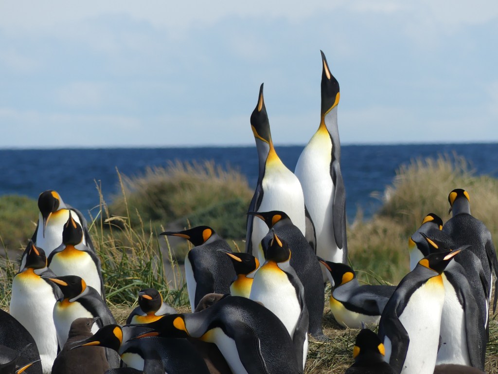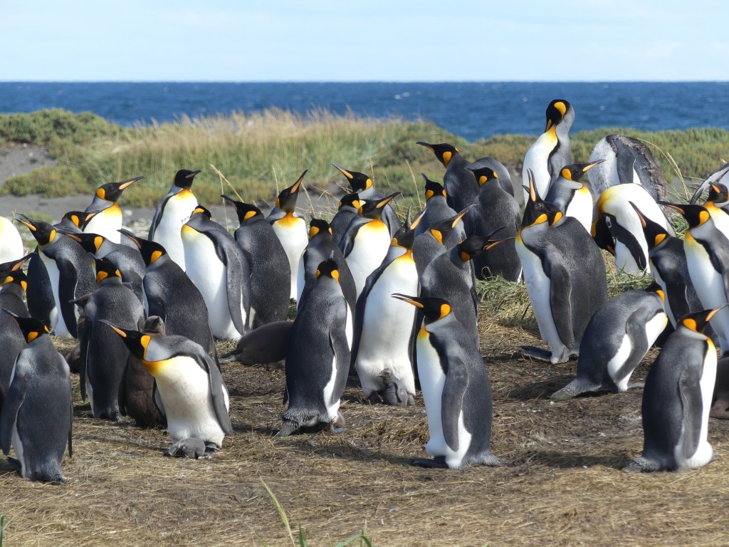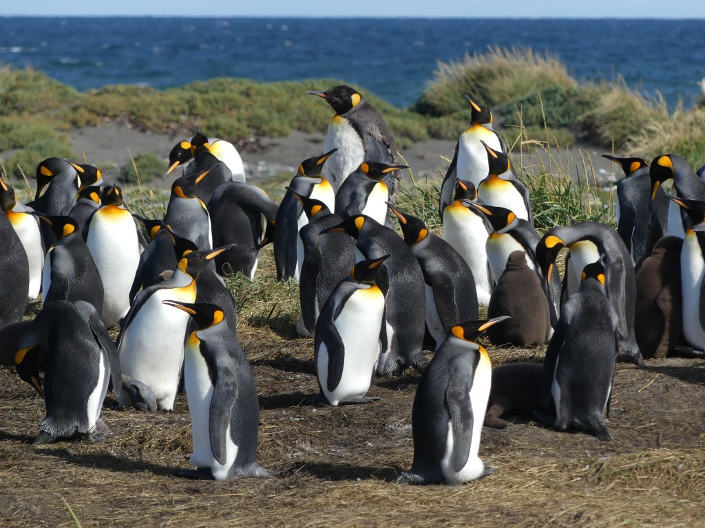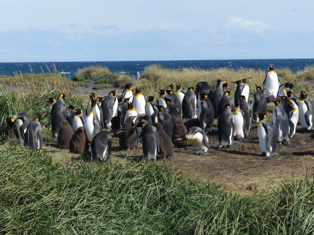 Eindelijk gaan we pinguïns zien en wel bij ‘Reserva Natural Pingüino Rey’, een natuurreservaat dat in 2011 is opgericht om de koningspinguïn te beschermen. Van Camerón is het nog geen uur rijden naar het park. Als we bij de plaats van bestemming aankomen, zien we vanaf de weg in het lege platte landschap een groep toeristen die een groep pinguïns fotografeert. Ze staan op slechts enkele meters van elkaar verwijderd. Het geheel doet wat ‘nep’ aan, omdat ze overduidelijk elkaar aankijken. “Is dit het?”, vraagt Ina verongelijkt. “Blijkbaar”, antwoordt Jeroen. We zijn ietwat teleurgesteld van het tafereel dat zich in de verte voor ons afspeelt, maar wachten geduldig af totdat wij aan de beurt zijn voor de rondleiding. Om het reservaat binnen te gaan, moeten we eerst onze schoenen ontsmetten. Onder begeleiding van een ranger lopen we naar de plaats waar op dat moment de zwemvogels zijn. Het tafereel dat wij zojuist van een afstand hebben gezien, maken wij nu zelf mee terwijl de gids ons voorziet van informatie.