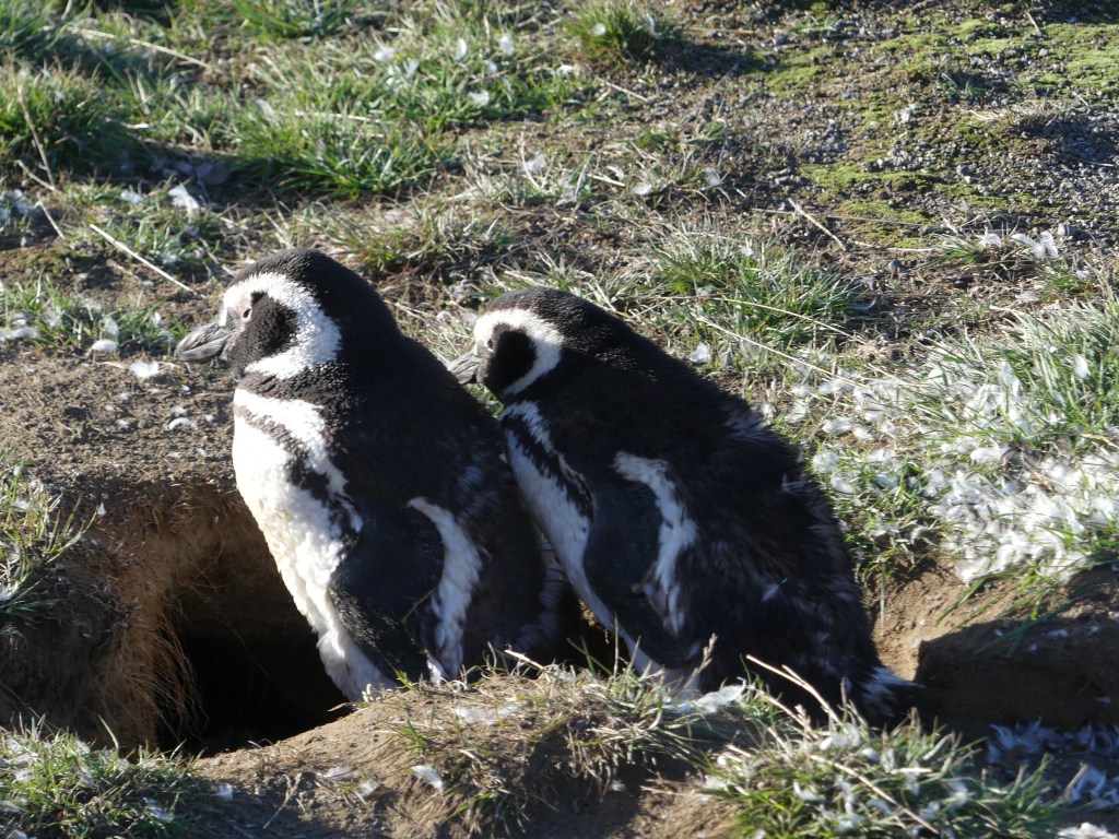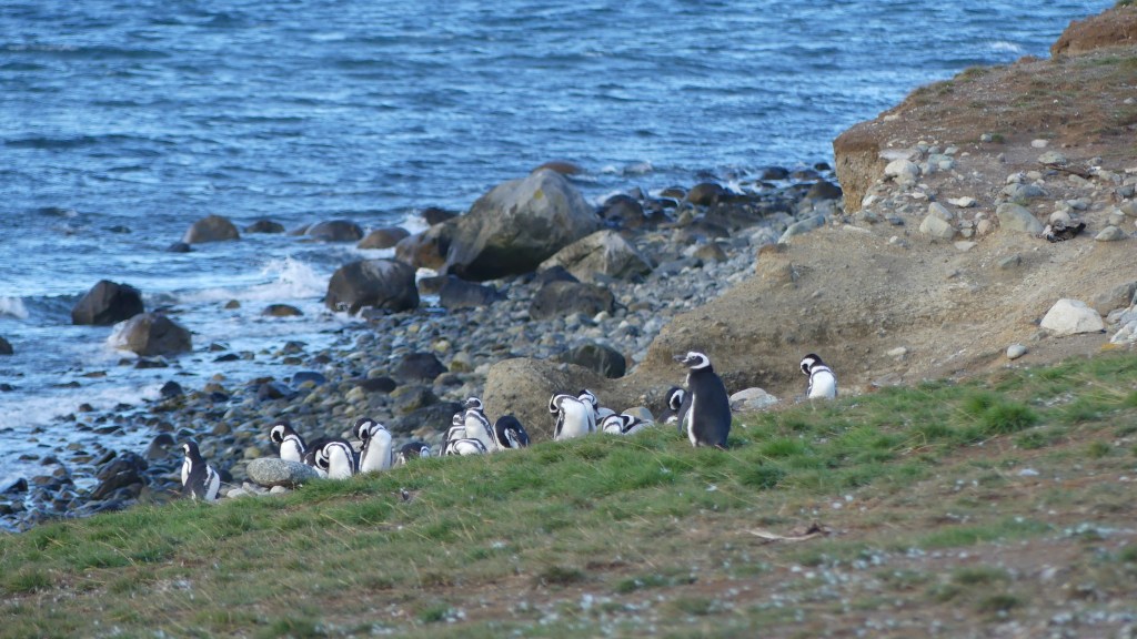 Het is zondag. We gaan buurten bij de Magellaan pinguïns, zeeleeuwen en zeeolifanten. Voor deze excursie moeten we heel vroeg uit de veren. De wekker gaat om 05.30 uur af. Snel kleden we ons aan, klappen de daktent dicht en rijden in het donker naar het kantoor in de nog stille stad waar de bus ons om 06.30 naar de boot gaat brengen. Dachten we. Bij het kantoor staan drie bussen met draaiende motor. Niemand zit in de bus, iedereen staat in een lange rij voor het kantoor om zich te melden. De rij wordt slechts tergend traag korter. Als we eindelijk bij de enige medewerkster aan de beurt zijn die onze namen op de lijst afvinkt, zegt ze dat we in bus nr. 2 kunnen instappen. Vervolgens vertrekken de drie bussen pas om 07.30 uur richting de boot. We zijn hoogst verbaasd. Hadden ze dat nou niet anders kunnen regelen? We hebben een uur en kwartier in de kou gestaan! Enfin, we zijn op weg. Na een half uur met de bus en drie kwartier met de boot arriveren we bij Isla Magdalena om de Magellaan pinguïns te bezoeken. We wandelen een rondje over een pad via de vuurtoren. Deze soort pinguïn is veel kleiner van stuk dan de koningspinguïns die we eerder zagen. Ook minder kleurrijk. Ze hebben hun nesten in holen in de grond en veel pinguïns zijn voor de jaarlijkse migratie al vertrokken naar het noorden. Omdat ze niet samenkomen als groep, is er ook weinig interactie en dus voor ons minder om te observeren. Kortom, na het bezoek aan de koningspinguïns valt dit een beetje tegen, verwend als we zijn ….