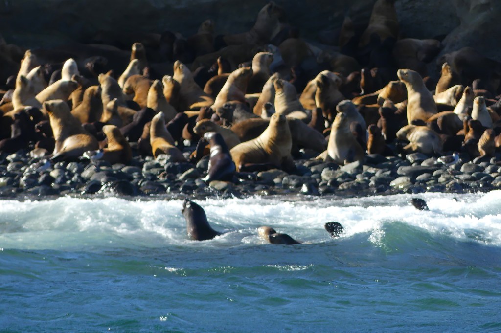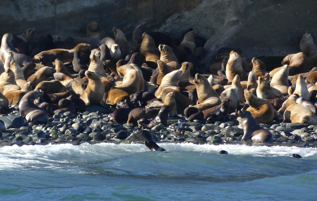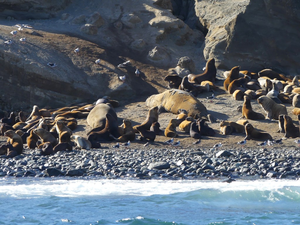 Terug op de boot krijgen we oploskoffie en varen we door naar Isla Marta. Er staat een hoge deining en we schudden flink heen en weer. Als we voor het eiland dobberen mogen we op het dek, zwemvesten aan en dan zien we een waar spektakel! Honderden zeeleeuwen en zelfs twee zeeolifanten liggen op het keienstrand. In het water duikelen spelende zeeleeuwen en allerlei soorten vogels, waaronder de albatros die van grote hoogte de zee in schieten om te vissen. Schitterend! We weten niet waar we moeten kijken. De mannetjes zeeleeuwen zijn werkelijk reusachtig en de zeeolifanten zijn zo enorm dat ze op het eerste gezicht rotsen lijken. Na 10 minuten besluit de kapitein dat we terug moeten, want de deining wordt te sterk (hetgeen te zien is aan de schokkerige video’s die we maken).