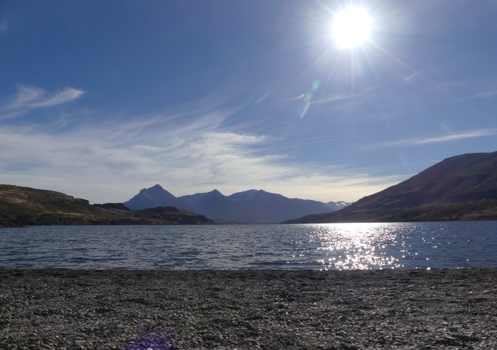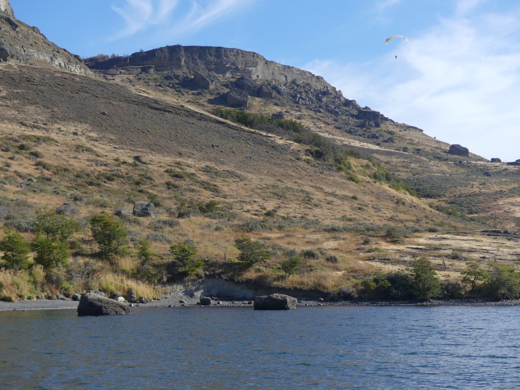 Het is te mooi weer om binnen te blijven dus gaan we weer op pad. De wind waait nauwelijks, de zon schijnt uitbundig, het is ongeveer 11 graden terwijl ergens in een fjord ‘onze’ boot ligt te schuilen voor de storm. Zo kan het onvoorspelbare weer verkeren in Patagonië. We rijden naar Lago Sofía waar diverse wandelpaden zijn. Als we Ruta 9 verlaten, vervolgen we de ripio Y280. Meteen worden we verrast door het prachtige heuvellandschap en zien we het meer. We zijn niet de enige personen, wel de enige toeristen. De mensen zitten op het kiezelstrand, kinderen spelen aan de waterkant of zwemmen zelfs in het meer. Er wordt gevist en de verte zien we kajakkers en ook een parapente onze richting op komen. We ruiken de parrilla en krijgen meteen trek, geconditioneerd als we zijn. Dit is een plek om te onthouden voor een schitterende bivak.